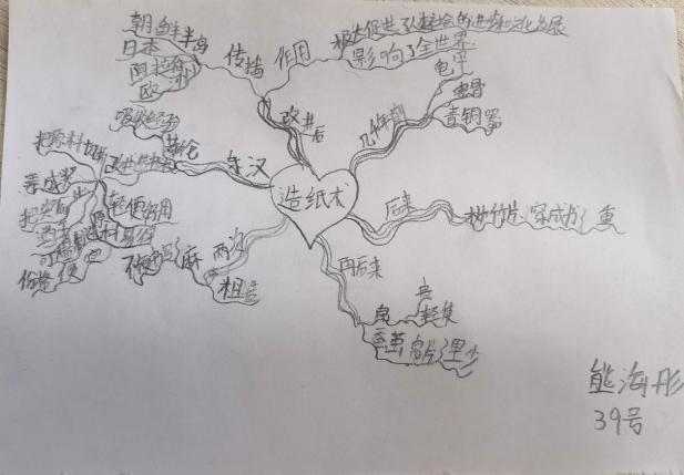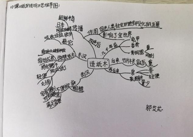 在第二次授课中,我教授的是《纸的发明》。我把思维导图与这篇课文结合并带入了课堂,教授了孩子们思维导图的画法,要求以及提取关键词的方法。没想到的是,孩子们第一次画导图就能表现突出,让我惊叹他们的理解力与创造力。