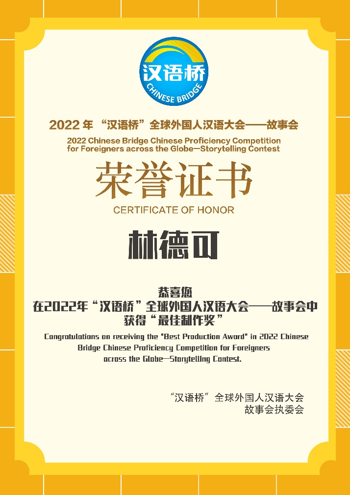 4月10日,由教育部中外语言交流合作中心主办,杭州文化广播电视集团承办的2022年“汉语桥”全球外国人汉语大会——故事会比赛结果公布,学校哥伦比亚籍2019级汉语国际教育专业硕士研究生林德可(FREDY ALBERTO TAMAYO OSSA)的参赛作品《突破》最终荣获“最佳制作奖”(10个“单项奖”作品之一)及“最佳指导教师奖”(8个“最佳指导奖”之一)。颁奖典礼在杭州通过线上、线下同步举办,学校参赛选手、指导老师及分管领导通过线上元宇宙颁奖典礼共同参加了颁奖活动。