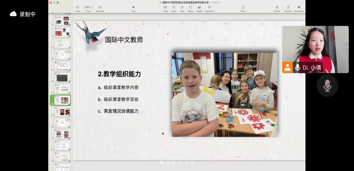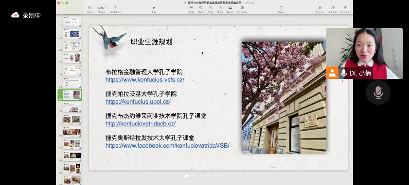 2023年3月17日,“缙云知华”大讲坛第十七期学术沙龙通过腾讯会议的形式在线上成功举办。讲座以“国际中文教师的职业生涯发展及教学经验分享”为主题,邀请学院优秀校友、捷克布拉格金融管理大学孔子学院文化协调员兼汉语教师、《欧洲时报》捷克办事处主任和布拉格泓蒙汉学堂副校长狄小倩老师为主讲人,学院汉教系主任杨甜老师及汉语国际教育硕士研究生聆听讲座。