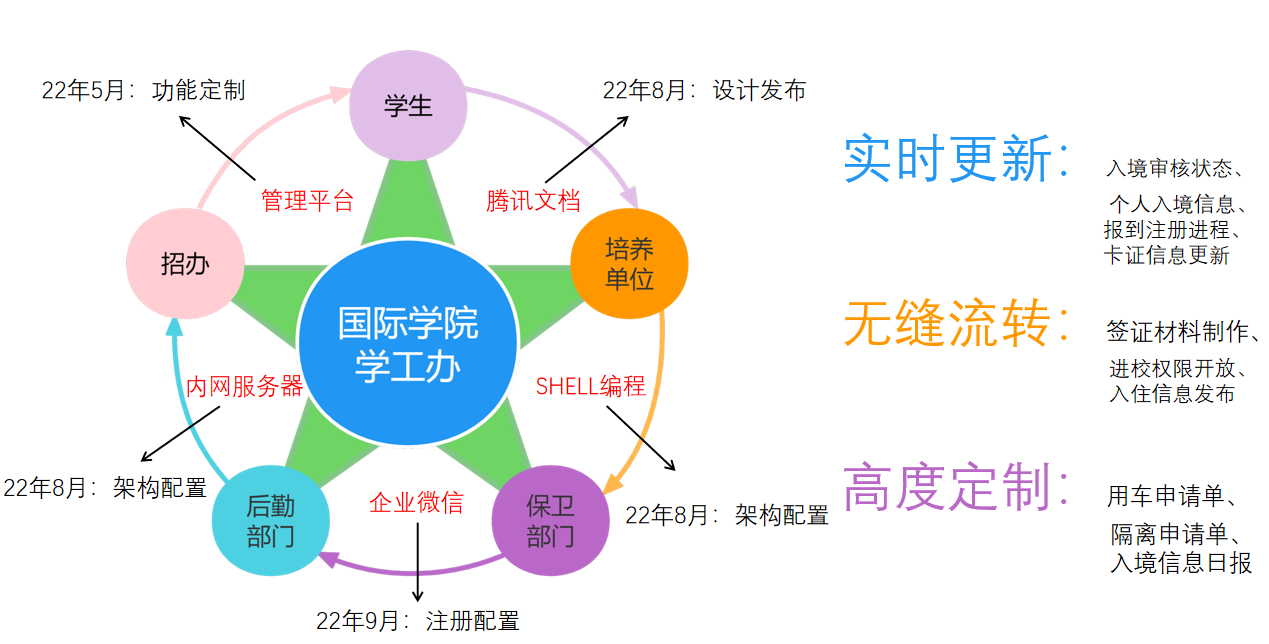 西南大学杨昆老师就学校国际学生入境返校和报到注册工作为例,分享西南大学利用企业微信、内网服务器编程、腾讯文档等信息化工具,力求国际学生入境返校和报到注册工作达到实时更新、无缝流转、高度定制三个标准。