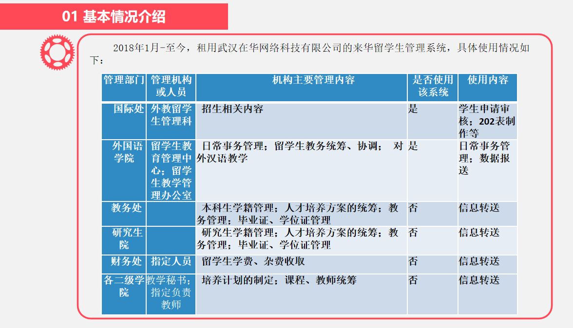 工作坊基于侯凯老师对调研的对象分类,分别邀请来自西南政法大学、重庆理工大学、四川外国语大学、重庆大学、西南大学的老师分享来华留学生信息化管理服务经验。西南政法大学邹丹老师作为“高校研发类”代表,讲述西政个性化定制来华留学生管理平台的全过程,并展示当前来华留学生管理平台的全貌。