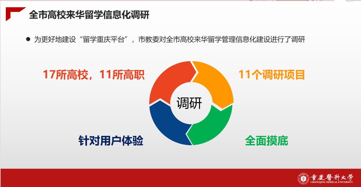 来自重庆医科大学的侯凯老师在对重庆17所普通高校、11所高职院校国际学生信息管理平台调研后,把各校信息化平台使用情况分为三大类:“在华国际类”“中研信达类”“高校研发类”,并对重庆各校来华留学信息化管理的优劣势做出分析研判。