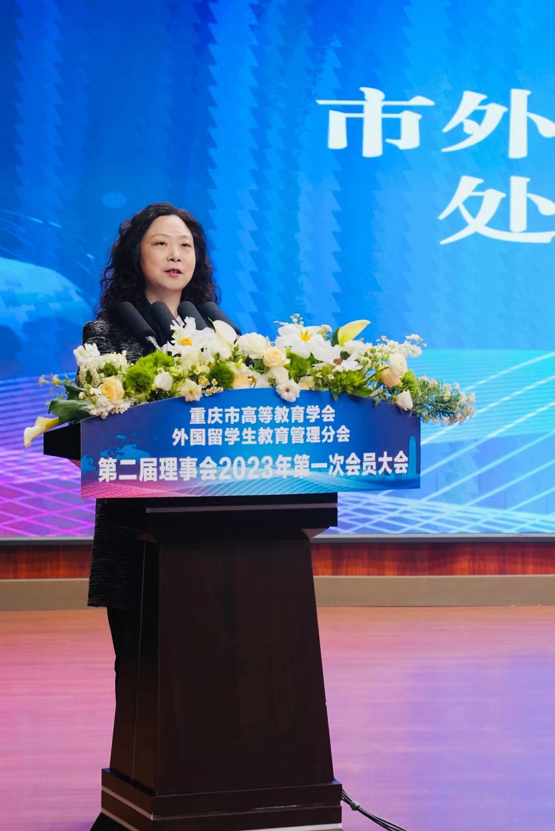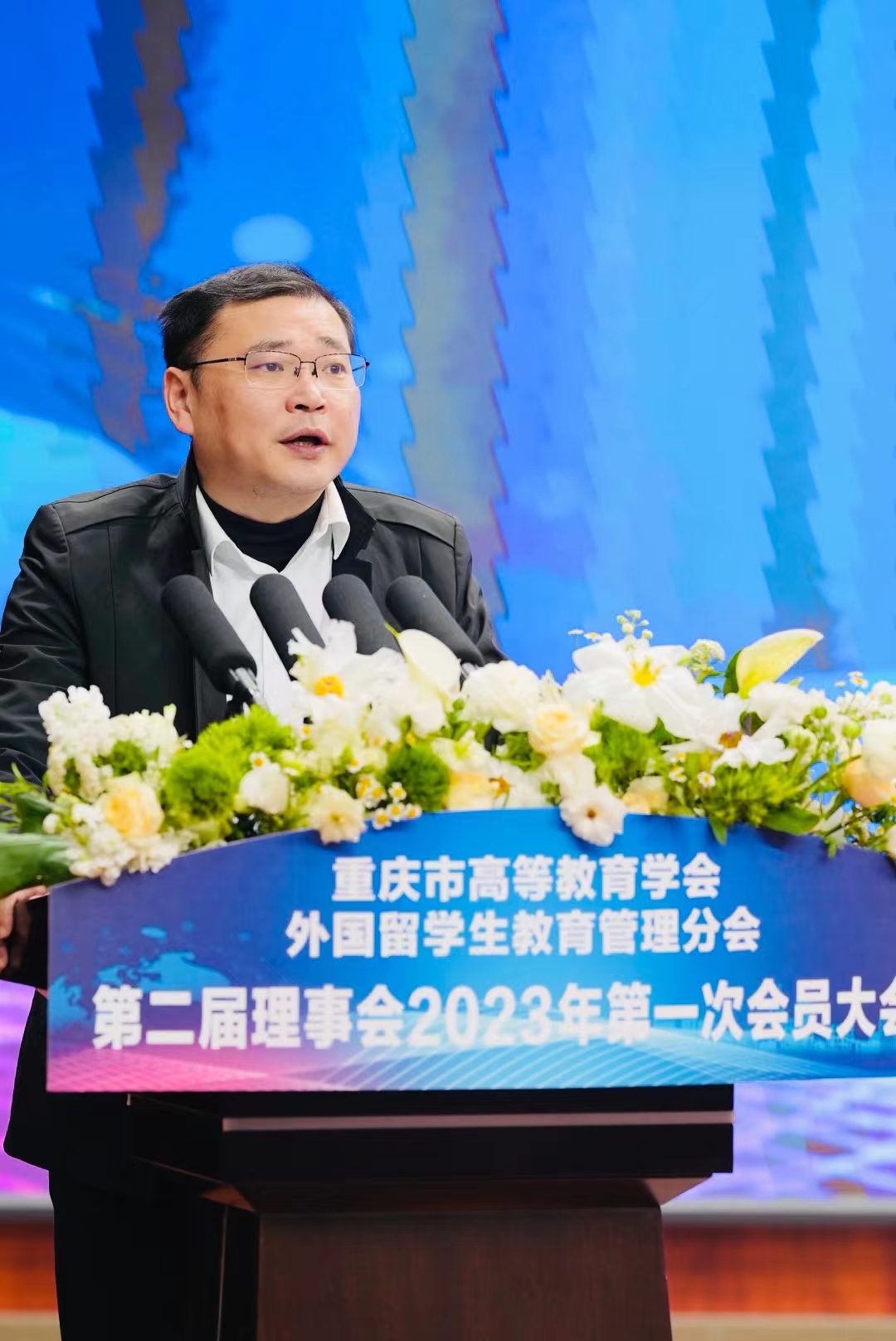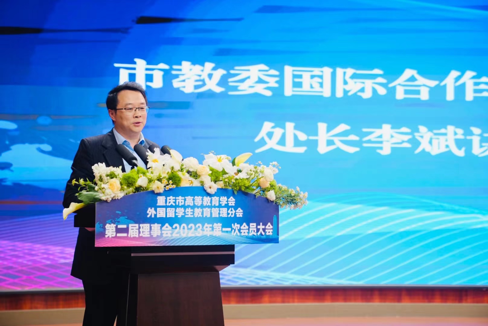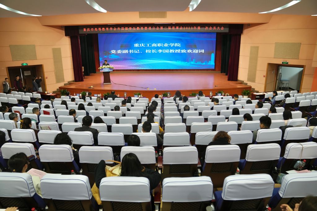 为学习贯彻党的二十大精神和习近平总书记关于教育的重要论述,推动全市来华留学事业高质量发展,3月22日,重庆市高等教育学会外国留学生教育管理分会第二届理事会2023年第一次会员大会在重庆工商职业学院华岩校区举行。市外办涉外管理处处长杨瑜、市公安局出入境管理总队总队长张攀、市教委国际合作与交流处处长李斌、重庆工商职业学院校长李国、市高教学会秘书长余志祥出席会议并讲话,全市37位会员单位理事及重庆市来华留学工作专家、来华留学先进个人代表100余人参加会议。