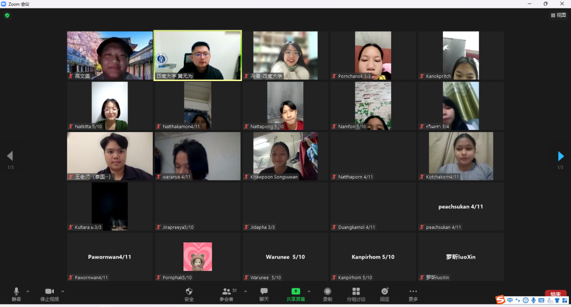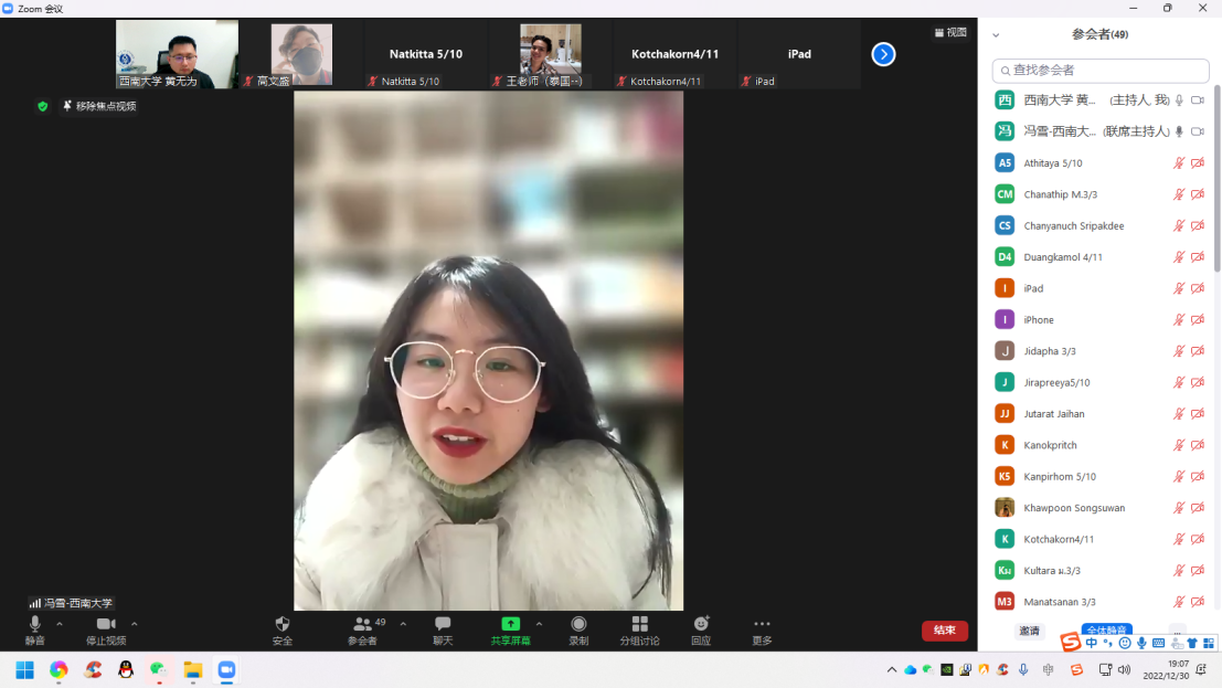 12月30日晚,西南大学2022年冬季汉语桥“玩转汉语,云游中国”中学生线上项目闭营仪式暨成果汇报展顺利举行,365上市公司(英国)集团汉教系本科教研室主任冯雪及授课老师、泰方负责老师王智、以及全体项目学生参加仪式。仪式由项目负责人黄无为主持。