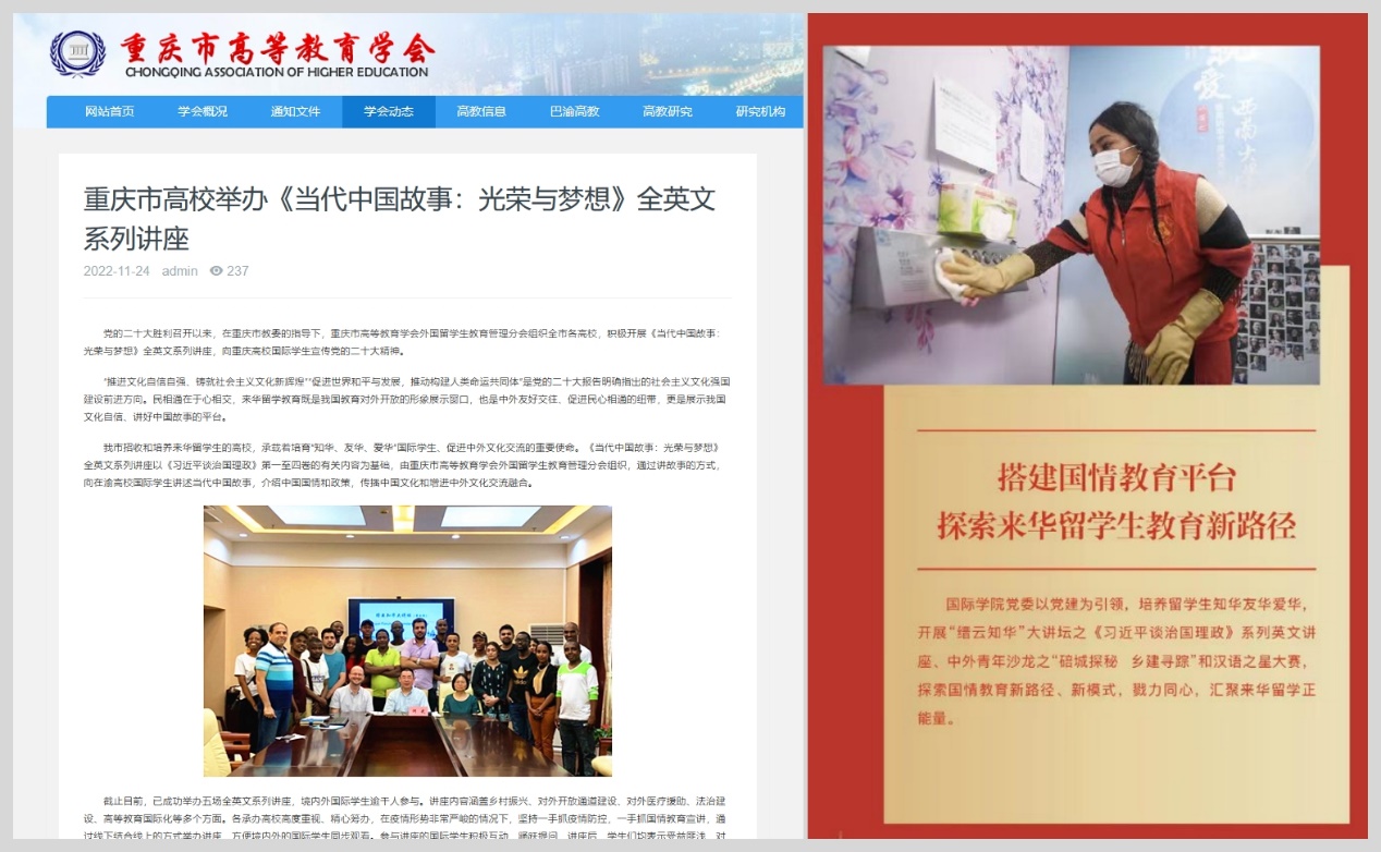 9. 学院发展面临新机遇。学校当选重庆市高等教育学会外国留学生教育管理分会第二届理事会理事长单位,重庆市高校首家“北碚区西南大学移民事务服务站”落户学校,学校修订并出台《西南大学全英文专业建设与管理办法》。