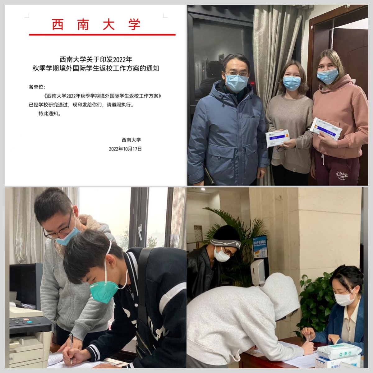 学院领导慰问入境返校学生、辅导员帮助办理入学报到手续 学院教职工参加学校疫情防控志愿服务