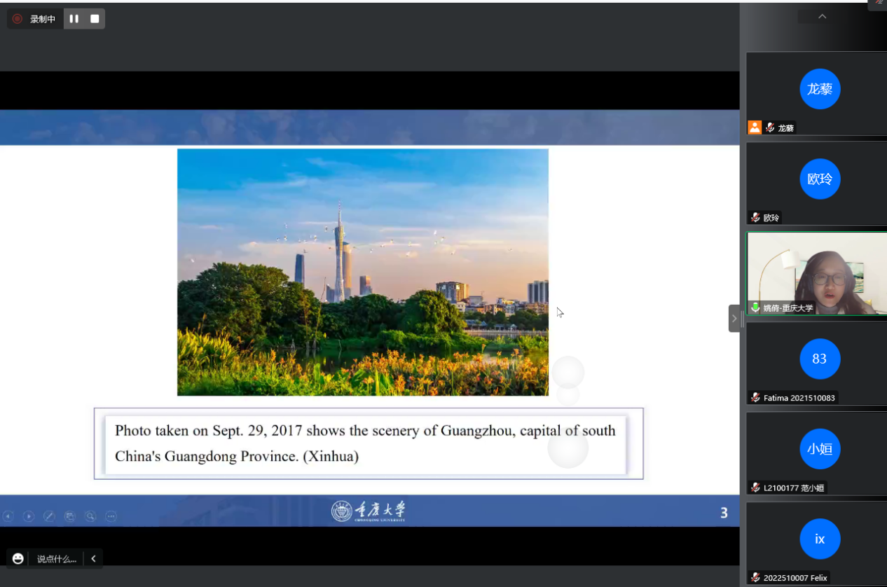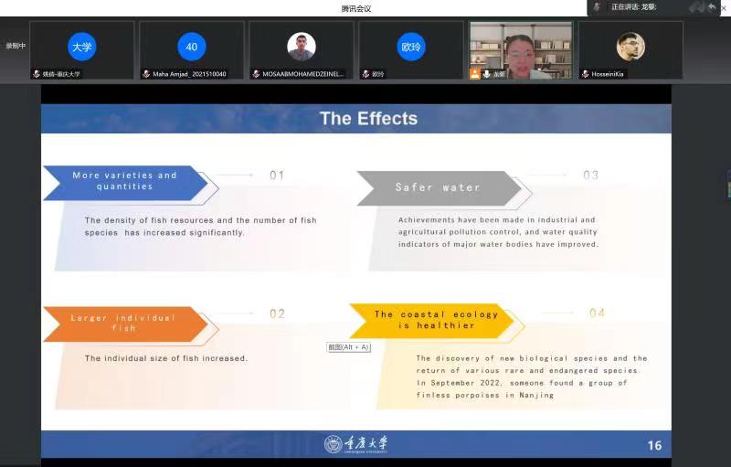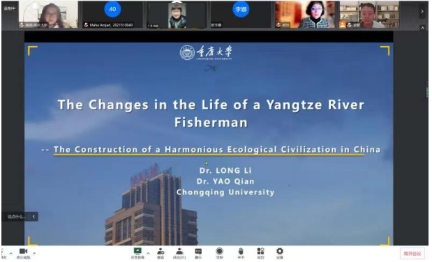 “向世界讲好中国故事”是我国建设文化强国的必经之路,也是我国立足国际视野、了解国际话语、融入世界舞台的重要途径。2022 年 12月20日19:00,“缙云知华”大讲坛专家讲座第十三期在重庆大学成功举办,主题为《一个长江渔民生活的变化——和谐共生的中国生态文明建设》,由重庆大学外国语学院龙藜副教授、姚倩博士主讲,外国语学院党委书记欧玲副教授主持讲座。受疫情影响,讲座以线上形式展开,重庆大学、西南大学国际学生和在渝其他高校国际学生近百人通过腾讯会议参加了讲座。