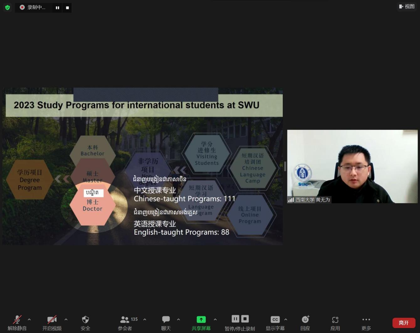 北京时间11月29日下午,HSK汉考国际柬埔寨线上教育展开展,学校受邀参加。为准确传递宣讲内容,增强宣讲感染力,确保宣讲效果,学校提前将所有宣讲材料翻译为中柬双语版本。招生办公室主任黄无为主讲,近190名柬埔寨学生参加宣讲会。