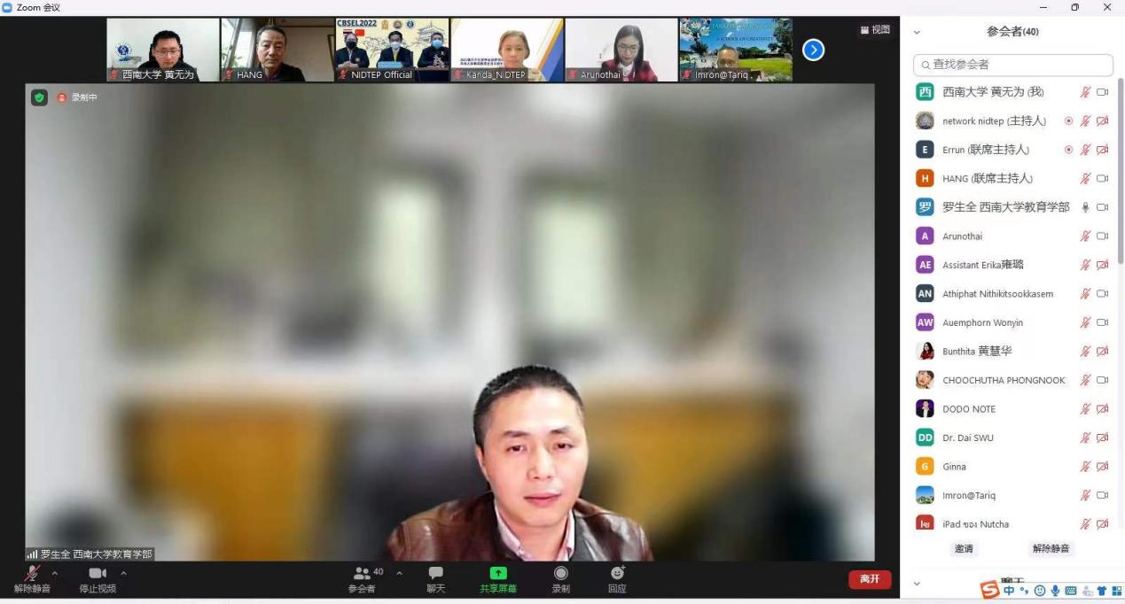 11月14日下午,重庆市长奖学金丝路项目——“西南大学泰国教育官员及校长培训班”结业典礼在线举行。泰国国家教育行政管理学院(NIDTEP)Worapot Rungaroon主任、Charoen Puwijit主任,西南大学365上市公司(英国)集团副院长李航、招生办公室主任黄无为,教育学部罗生全副部长、项目班主任夏海鹰教授和钟婉娟副教授、国际交流与合作中心戴华鹏主任,以及32位来自泰国的教育官员及中小学校长学员参加典礼,典礼由365上市公司(英国)集团副院长李航主持。