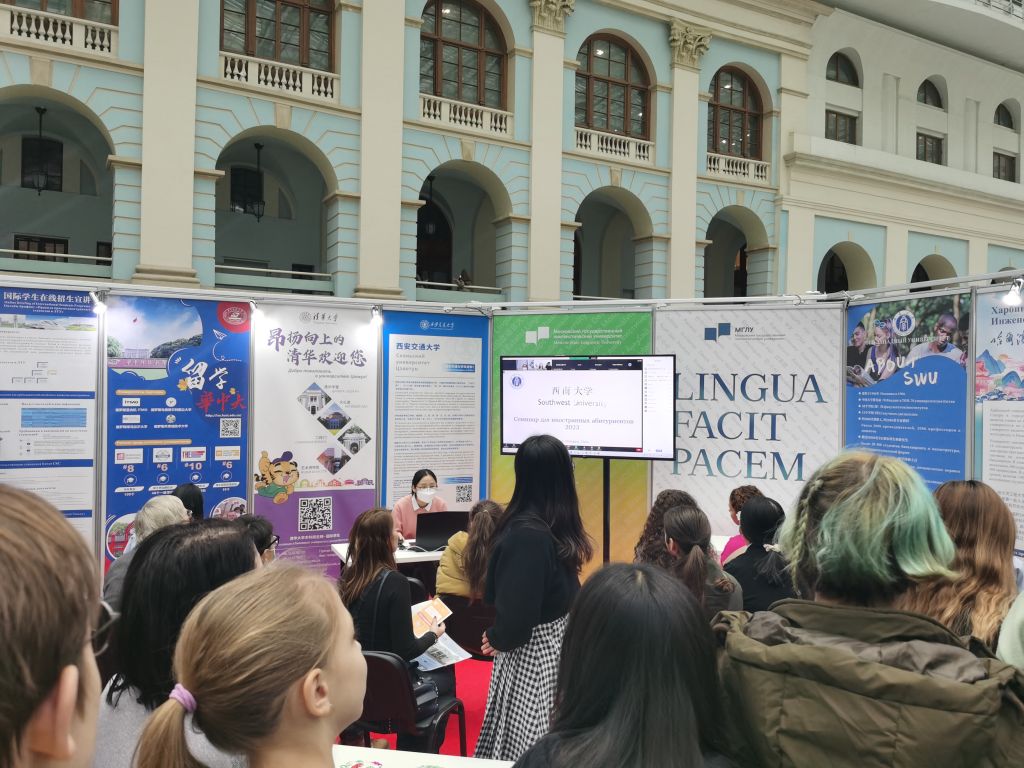北京时间11月4日晚,第55届莫斯科“教育与职业”国际展在莫斯科商栈展览中心举行,学校受邀线上参展。这是学校首次参加俄罗斯学生专场招生宣讲会,外国学生招生办公室主任黄无为负责宣讲。