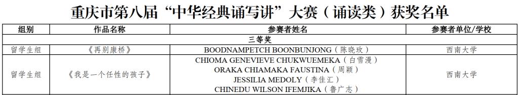 近日,重庆市第八届“中华经典诵写讲”大赛评选结果公示,学校留学生在此次大赛中喜获佳绩:汉语国际教育本科专业泰国籍学生陈晓玫的参赛作品《再别康桥》,尼日利亚籍学生白雪漫、周颖、鲁广志和印度尼西亚籍学生李佳汇的参赛作品《我是一个任性的孩子》分别荣获大赛诵读类留学生组三等奖;学校获大赛优秀组织奖。