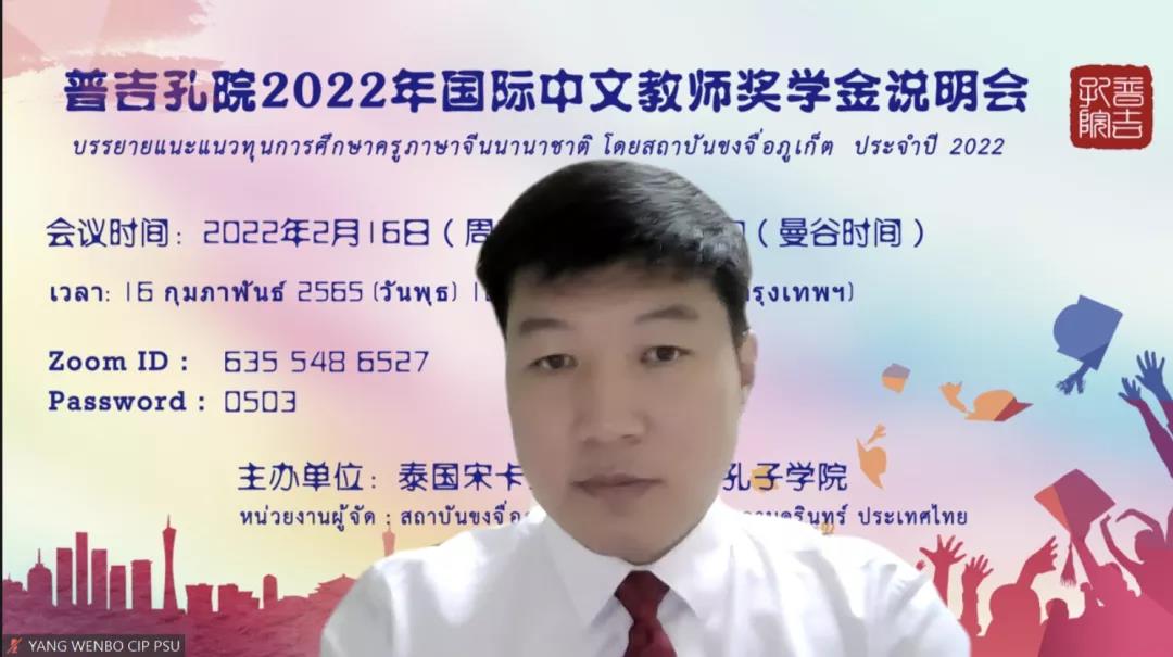 2月16日晚,学校受邀参加宋卡王子大学普吉孔子学院(以下简称普吉孔院)“2022年国际中文教师奖学金线上说明会”,帮助有意申请奖学金来华留学的泰国师生了解中国大学和汉语国际教育专业,梳理申请流程和注意事项,来自泰南地区多所中学、大学的100余名师生参加说明会,说明会由普吉孔院中方院长杨文波博士主持,普吉孔院、学校和上海大学、天津大学等代表在线宣讲。