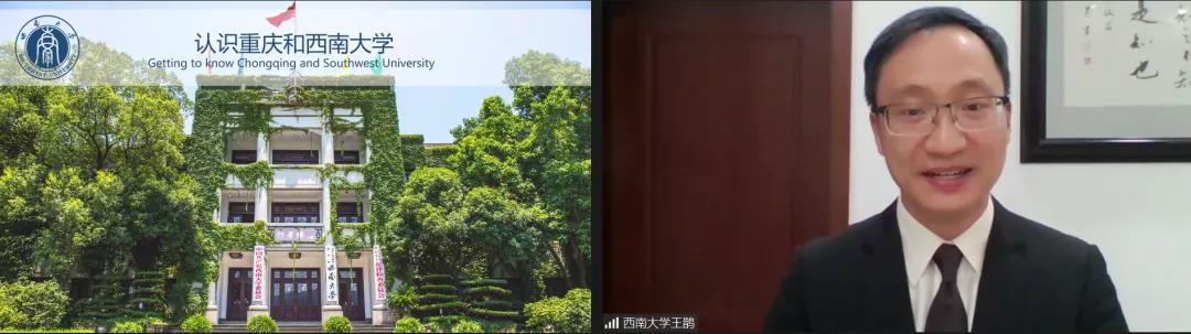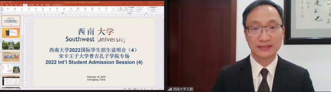 学校外国学生招生办项目负责人王鹊通过视频和PPT扼要介绍重庆和学校校园文化、办学特色、生活条件等,重点讲解奖学金申请和选择学校国际中文教师奖学金的四大理由(即:预录取授予率超96%、非孔院学生可由我校推荐、合作项目名额优先投放、“本土汉语教师提升项目”优先支持)。