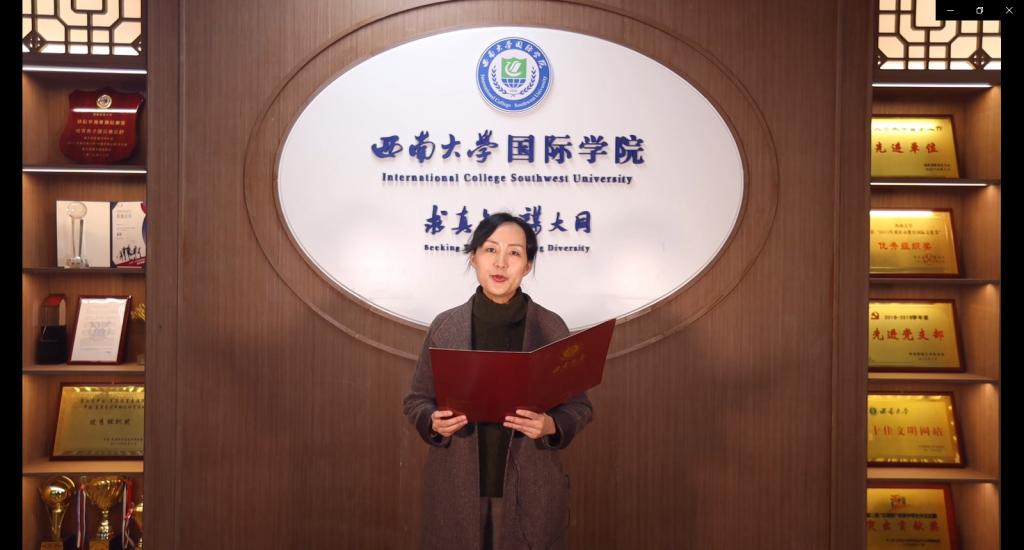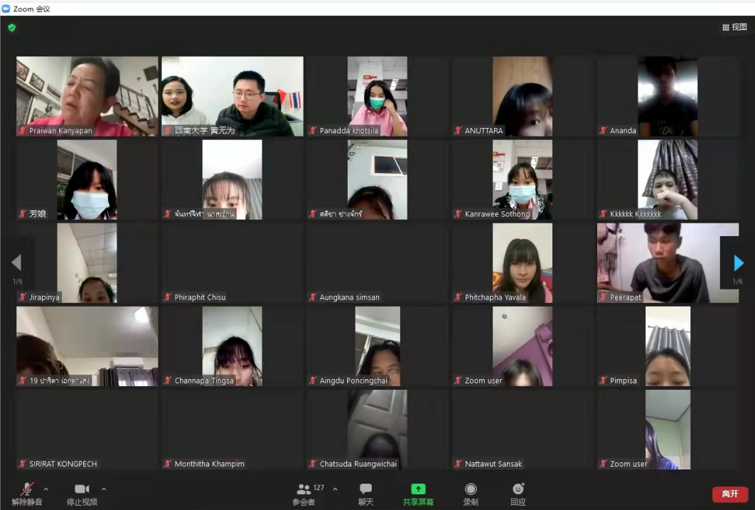 2月15日晚6点,西南大学-泰国孔敬大学孔子学院“玩转汉语,云游中国”中学生线上项目正式开营,泰方洪邵玲(Mrs.Praiwan Kanyapan)老师和276名泰国学生参加开营仪式,仪式由项目负责人黄无为主持,泰国留学生王丽兰担任翻译。