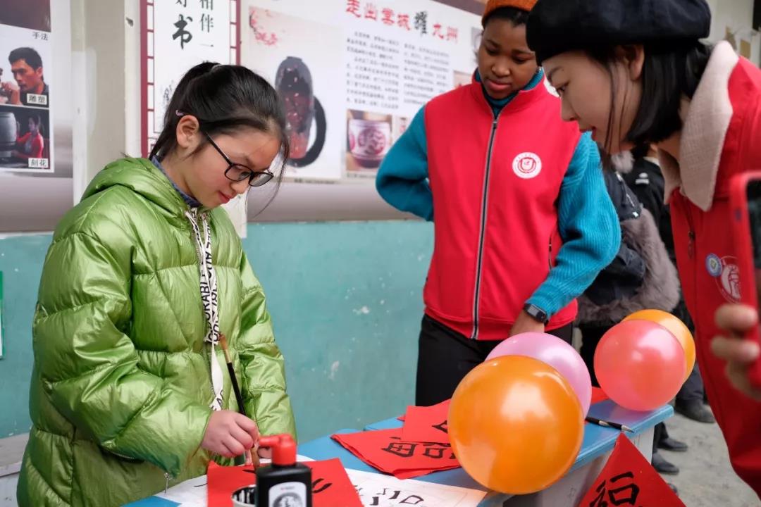 书法学习摊位上的孩子不多,偶尔来一两个孩子,都能拥有安安静静的时光,她们的笑意来源于不与周围争吵的时光。志愿者主要带着大家写福字,每一横每一勾,都细细讲述着中国文化传承的故事。留学生志愿者也在这个摊位上,当稚嫩的手颤颤巍巍时,来自异国他乡的扶持牵引着它,探索世界共融的奥秘。