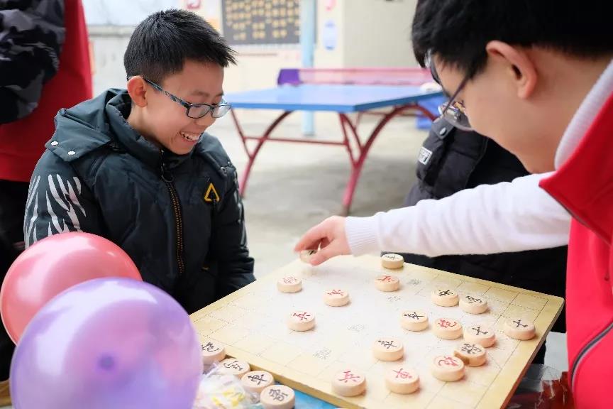 在象棋围棋摊位前,志愿者简单讲解完规则后,先是志愿者与同学对弈,再是同学之间对弈,每一次的进退攻守,胜败输赢都会看到棋盘上浮现激动的笑容。从不会下棋到粗懂规则,再到掌握些许策略,孩子们在棋类游戏的抓耳挠腮中摸索道路,他们每一小步的成功,都会让会场多一抹登上新阶梯的笑。