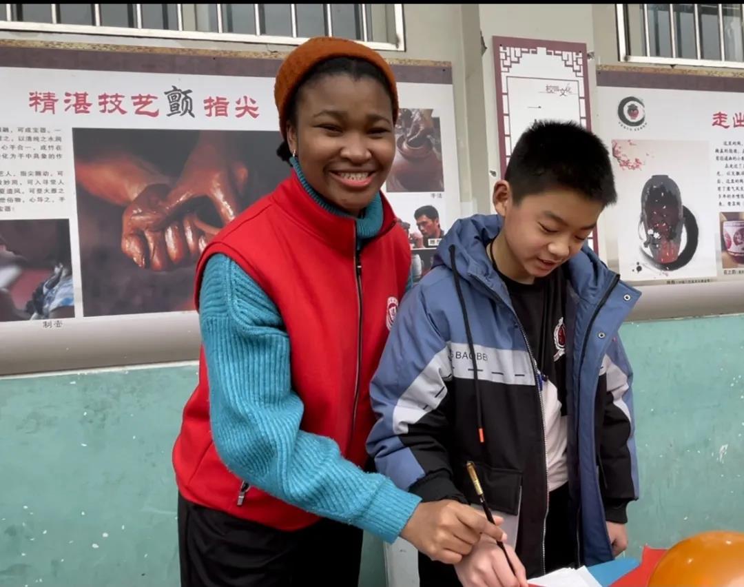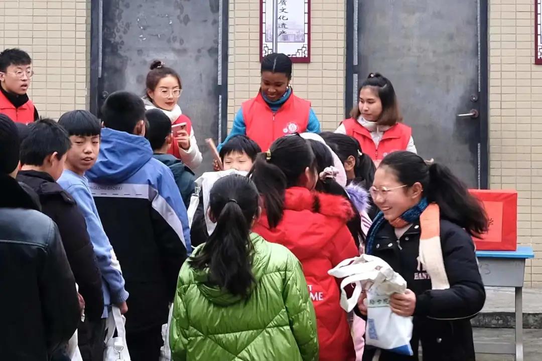 伴随着掌声,国际学生周颖(尼日利亚)和孙素荷(泰国)为每位同学分发学习用品,孩子们开心又兴奋。