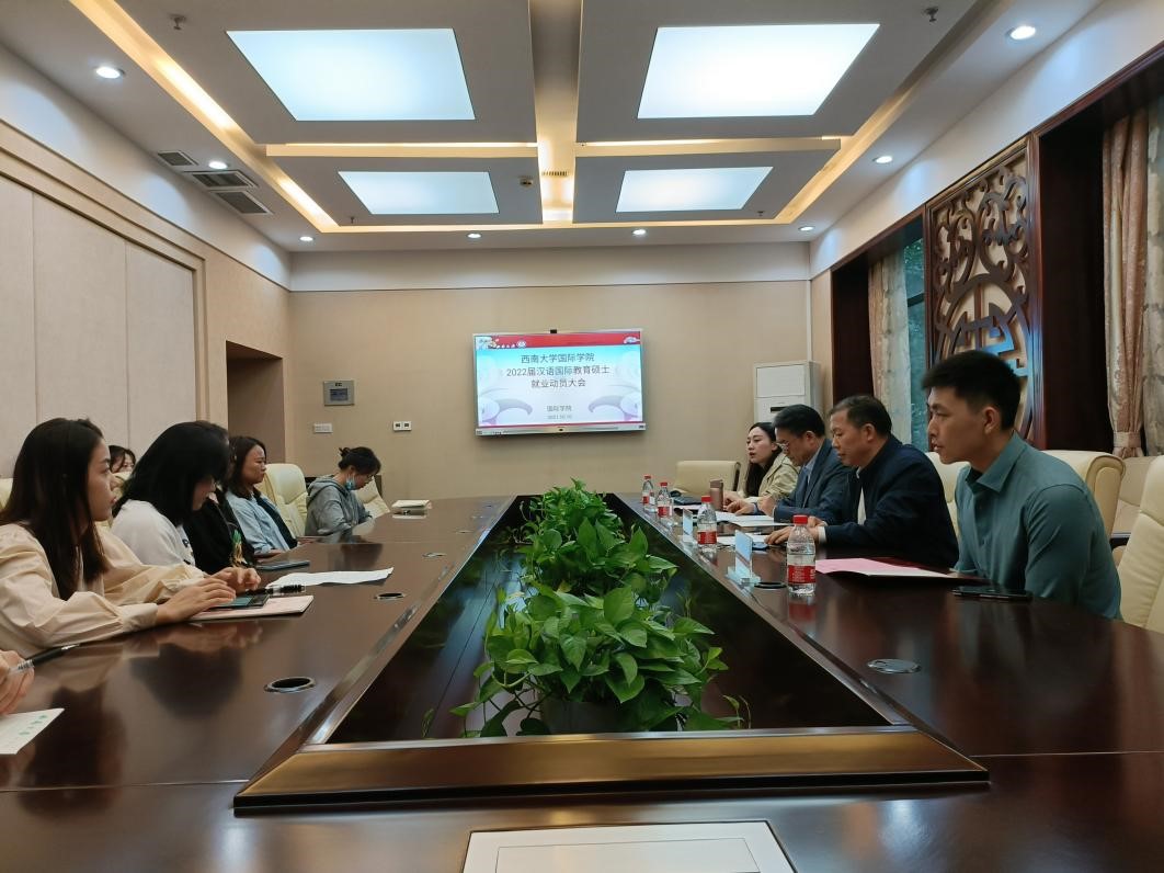 2021年10月10日下午3点,学院2022届汉语国际教育硕士毕业生就业动员大会在紫云楼签约室举行。刘猛书记、刘承宇院长、2021届优秀毕业生代表陈贤德及2019级全体汉语国际教育硕士研究生参加会议,会议由研究生辅导员汪鑫阳主持。