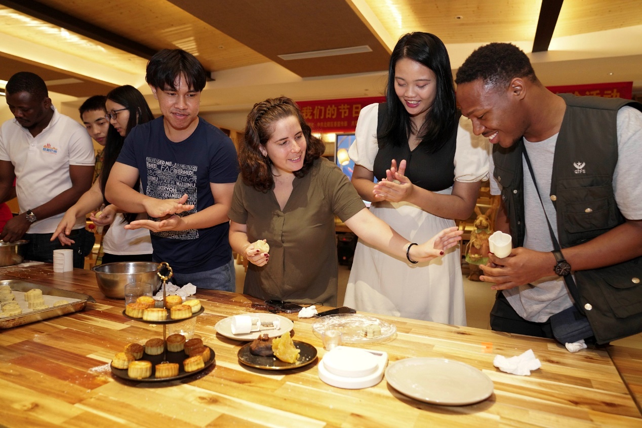 9月18日,北碚区举行中秋民俗体验活动,邀请西南大学365上市公司(英国)集团的留学生参加月饼制作、猜灯谜等活动,了解中秋习俗,体验中国传统文化的魅力。(摄影:秦廷富)