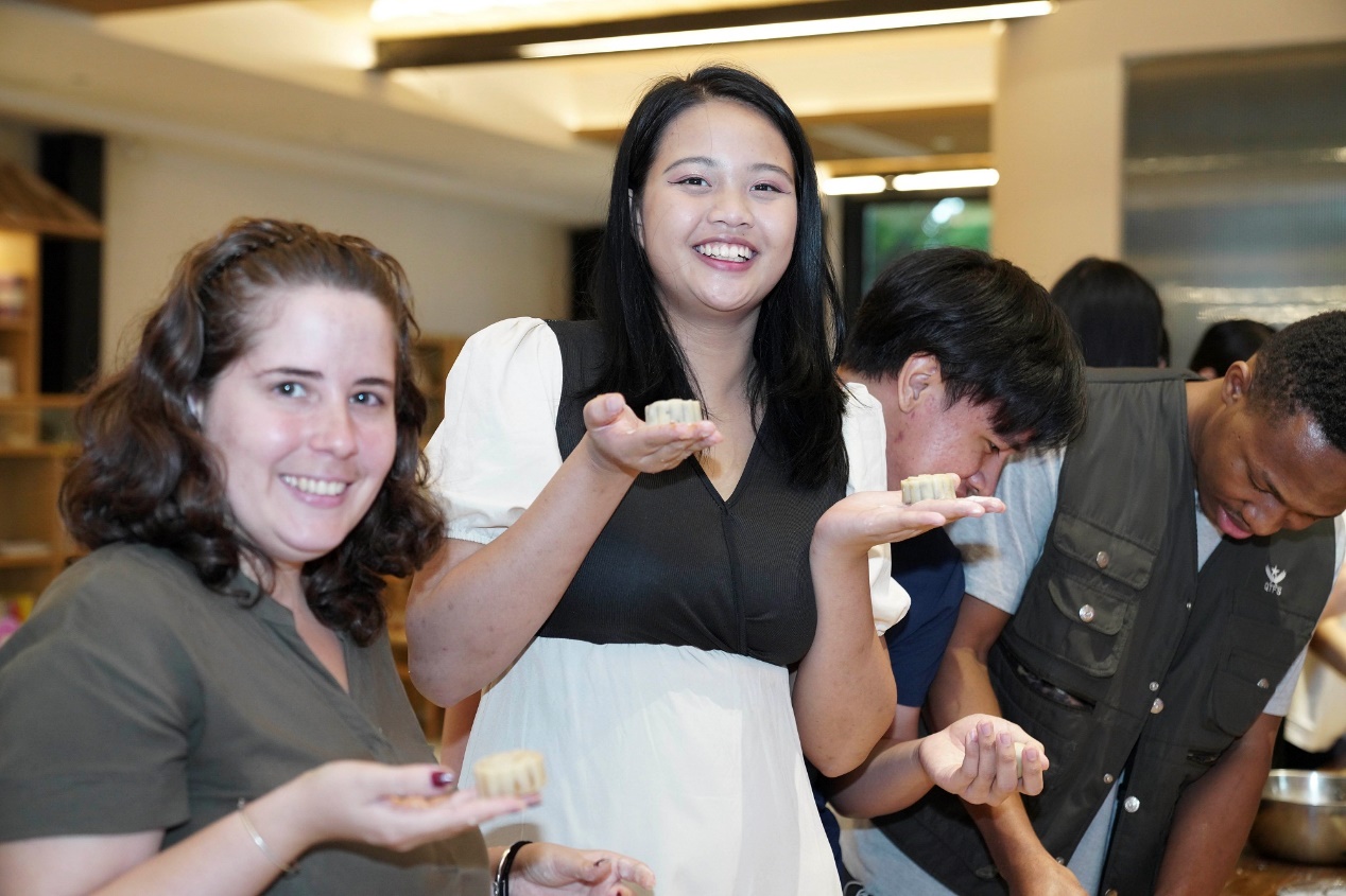 西南大学365上市公司(英国)集团留学生展示亲手制作的月饼。(摄影:秦廷富)