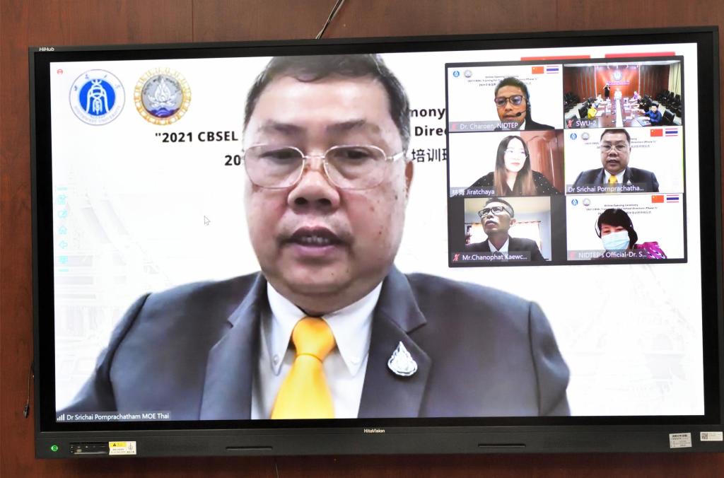 泰国教育部督察长斯彩先生代表泰国教育部致辞,对重庆市教育委员会的支持表示衷心感谢,对学校与泰国教育部紧密合作所取得的成就表示祝贺。指出,泰国教育官员及校长培训项目在“一带一路”倡议的大背景下举行,克服了新冠肺炎疫情所带来的各种挑战,体现了中泰两国人民友好交往美好而又迫切的愿望,希望以该项目为重要基础和载体,开启两国教育交流合作的新篇章。
