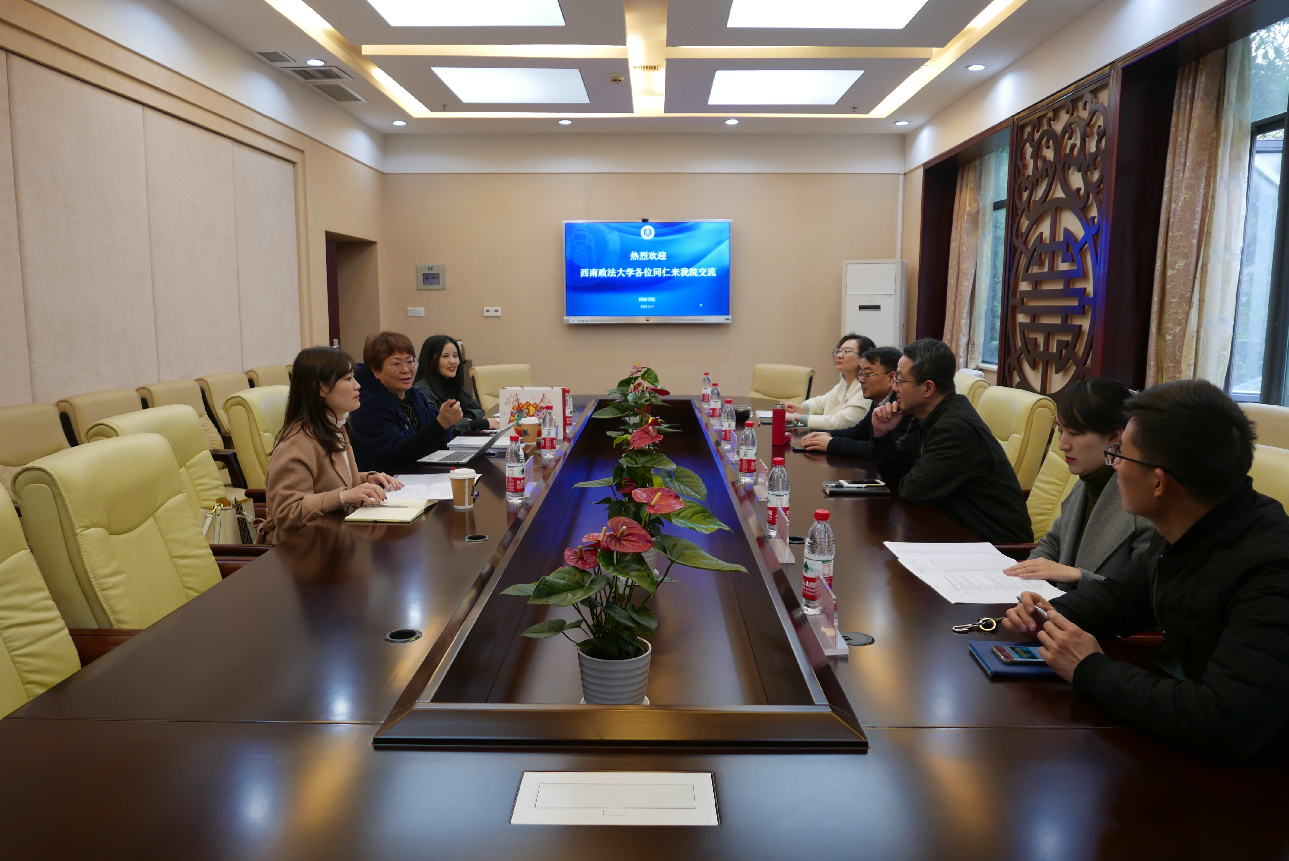 3月11日,西南政法大学国际教育学院秦洁副院长一行三人来院考察交流。副院长李航、张家政和相关科室负责人在紫云楼签约室与客人进行了座谈交流。