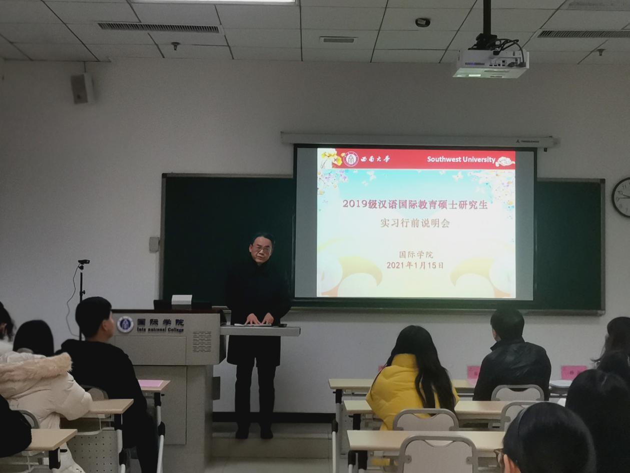 1月15日上午9点,学院在紫云楼312室举行2019级汉语国教育硕士实习行前说明会,刘猛书记、张家政副院长,汉教系主任杨甜、教学办主任邹育艳、学工办主任杨昆以及全体2019级汉硕生参加会议,会议由研究生辅导员汪鑫阳主持。