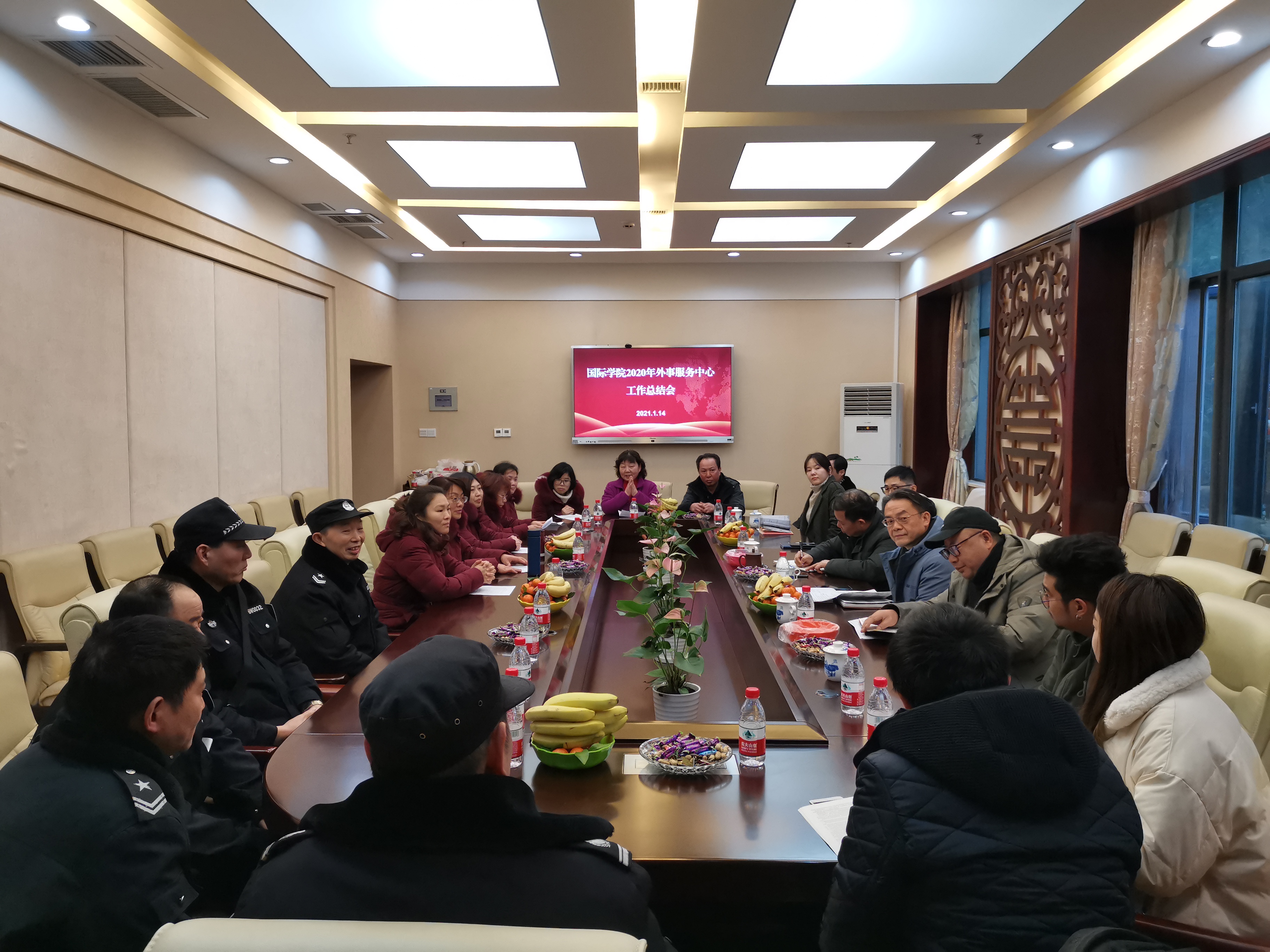 2021年1月14日上午,学院在紫云楼签约室举行2020年外事服务工作总结会,党总支书记刘猛、院长刘承宇,以及教师代表、中外学生代表和全体外事服务中心工作人员参加会议。
