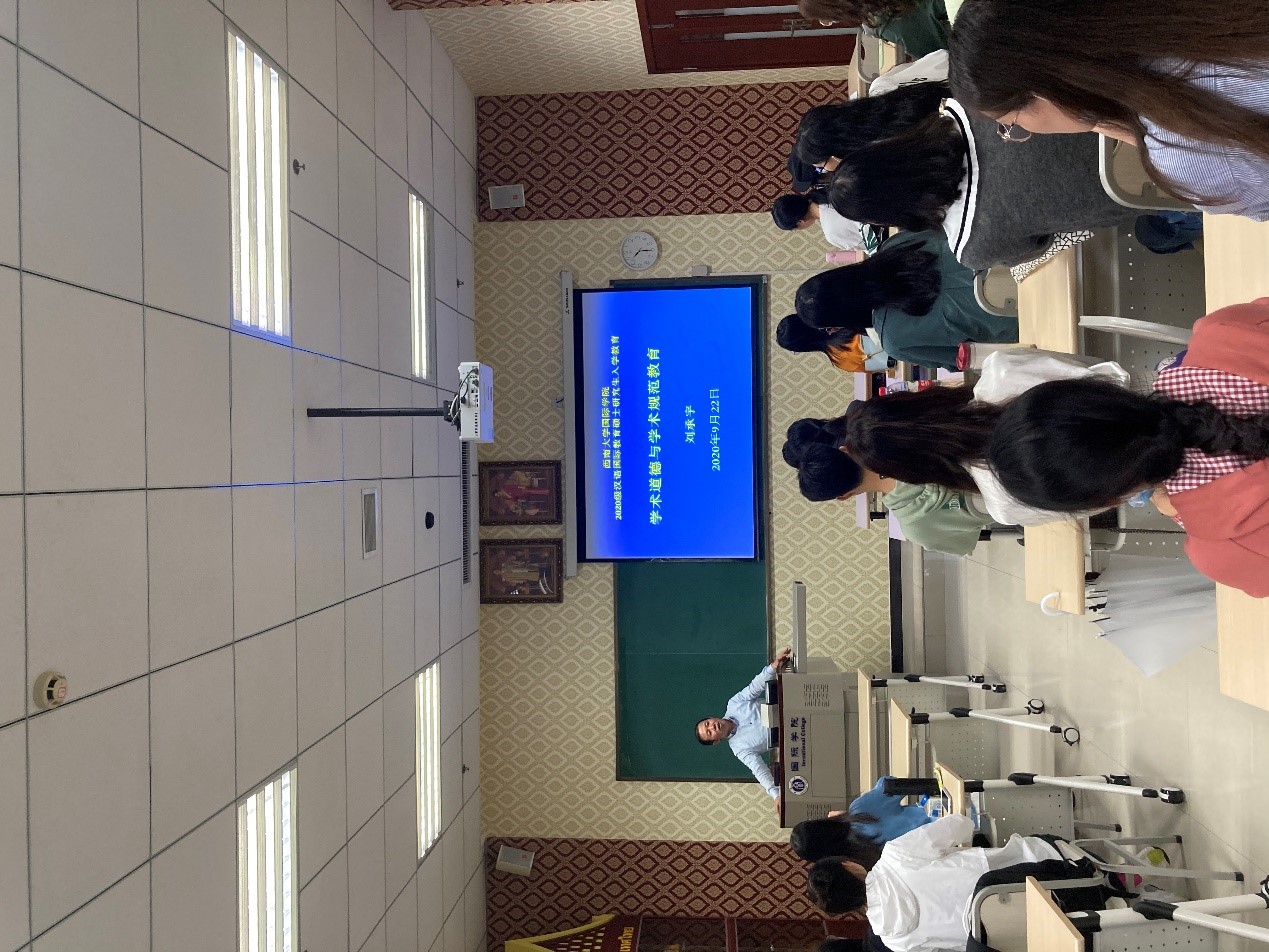 典礼结束后,刘承宇院长在210教室对新生们进行了“学术规范与学术道德教育”主题讲座。刘院长在讲座中引经据典地强调了学术规范与学术道德的重要性,警示同学们应严肃对待学术,潜心研究,努力成为合格的研究生。