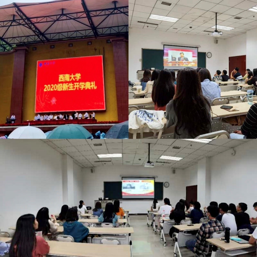 2020年9月21日上午8:30,学校新生开学典礼在第一运动场举行,学院37位新同学全体到场参与了本次典礼。校长张卫国在典礼上致辞,以“在变化中塑造自我”为主题,鼓励同学们不断进取、继往开来,将西大精神发扬光大。下午14:30-15:10,同学们来到学院312教室,观看了“开学第一课”直播和中央电视台抗疫主题“开学第一课”录像。晚上7点,同学们在辅导员景柯沥老师的带领下观看了学校纪录片和学唱校歌,学习西大的校训、学校精神等,引导同学们感受学校浓厚的校园氛围、建立身份认同。