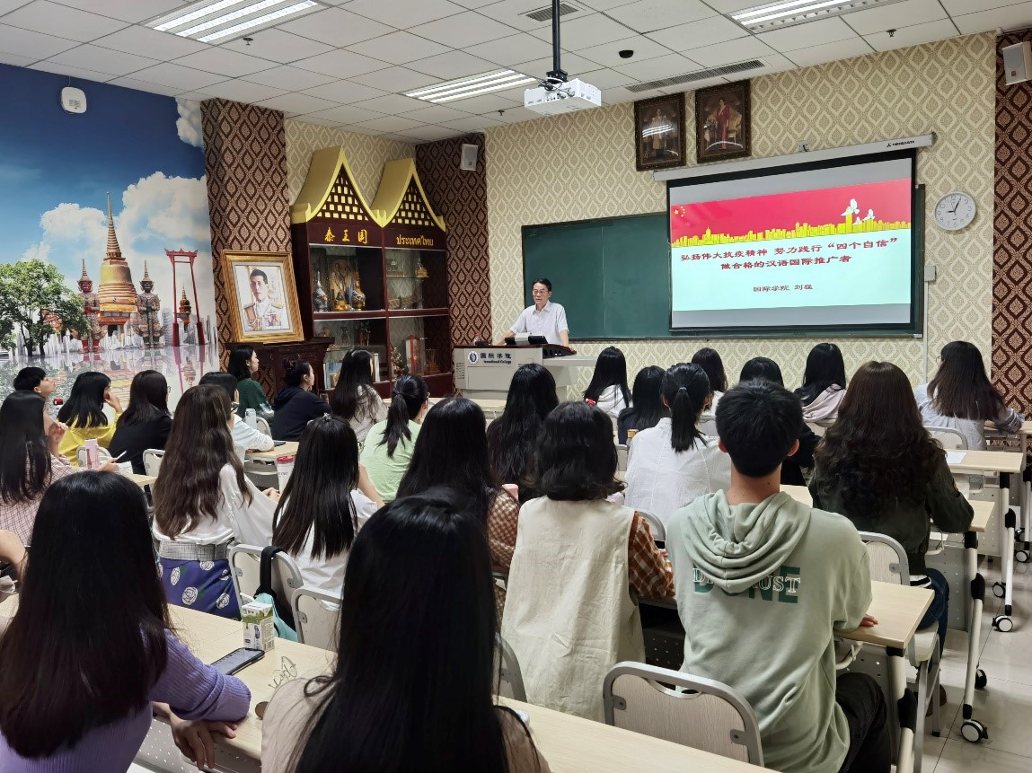 9月23日上午9:00,刘猛书记在210教室进行了“弘扬伟大抗疫精神、努力践行‘四个自信’、做合格的汉语国际推广者”主题讲座。在讲座中,刘猛书记与同学们探讨了对抗疫精神、四个自信的理解和汉语国际推广面临的困境和问题,嘱托同学们珍惜学习机会,认清自己的使命,为汉语国际教育事业贡献自己的力量。