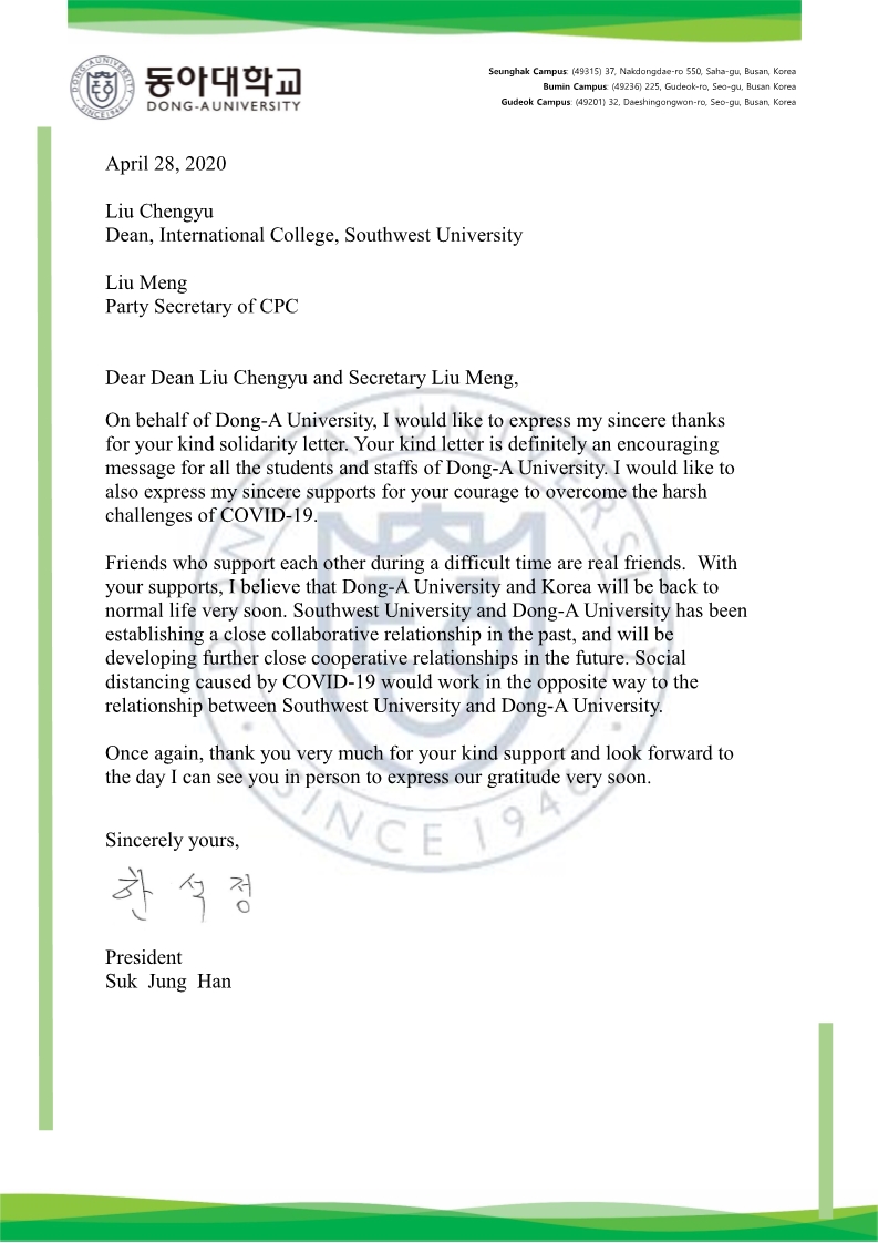韩国东亚大学校长韩锡政先生对学院表示感谢并对学校战胜疫情的严峻挑战表达敬意。强调,在困难时期相互扶持的朋友才是真正的朋友,相信两校将保持并进一步发展紧密的合作关系,两校的友谊将因共同面对此次挑战而变得更加深厚牢固。