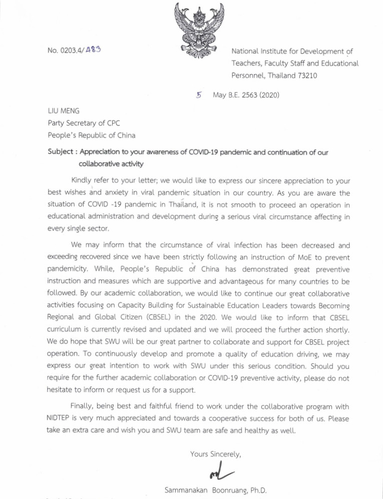 泰国行政管理学院院长萨玛纳堪 • 薄倰先生在给学院的回信中,表达了对中国抗疫取得伟大胜利的钦佩之情。表示,在泰国人民的共同努力下,最新感染人数已经呈现下降趋势,在抗疫过程中借鉴了宝贵的中国经验。期待在疫情结束后,双方继续实施已成功举办的三届泰国校长及教育官员培训项目,进一步拓展双方合作领域,开展更多务实合作。