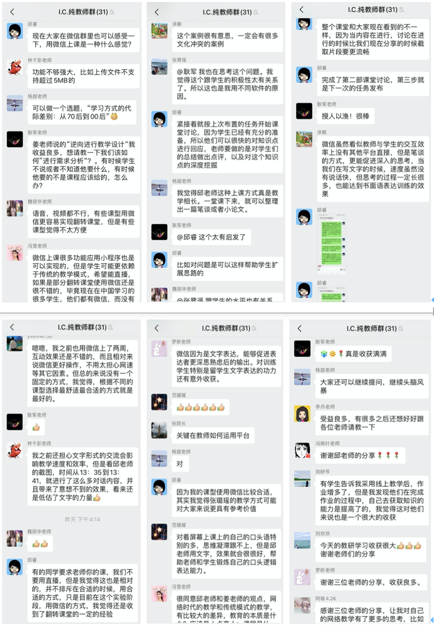 邱睿老师以汉语国际教育硕士《中外文化交流专题》为例,介绍了自己使用微信授课的课程案例。她指出,微信授课让学生有机会与老师进行深度的思维碰撞,极大的锻炼了学生的写作能力,学生有时在短短几分钟内能够写出很有逻辑的思想,获得了极大的成就感,同时恒定的文字记录可供反复翻看。邱老师极具启发性的分享引发了全体教师的激烈讨论,改变了大家对微信授课的固有看法。