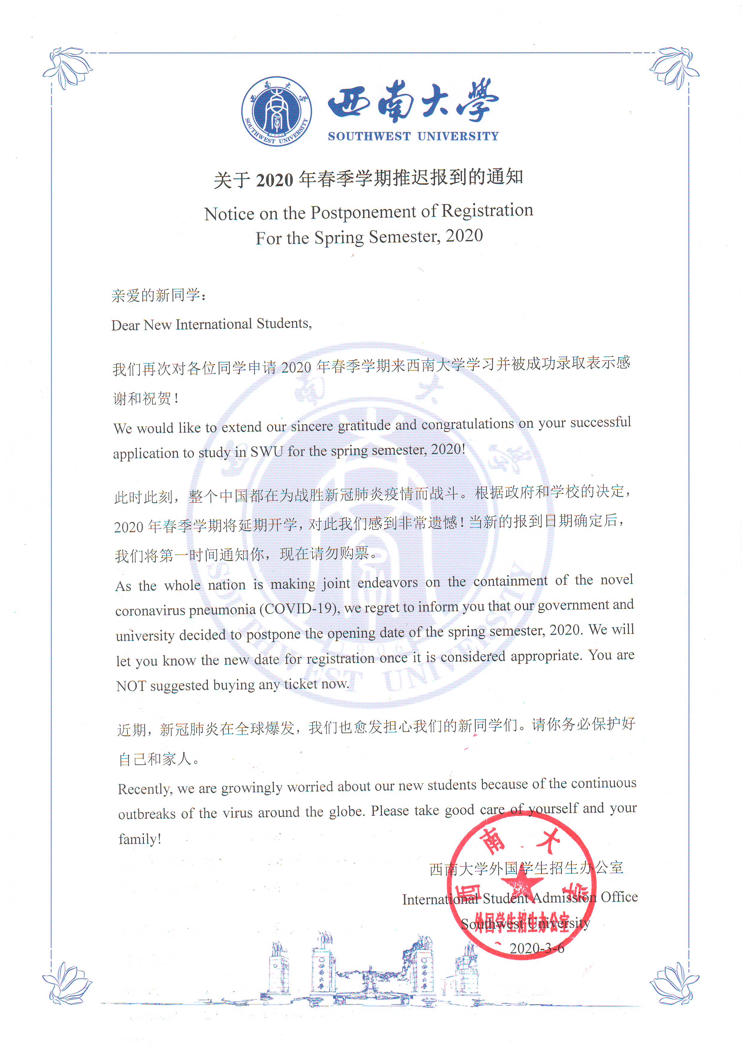 学院通过网站公告、微信群发、邮件通知等多种方式发布中英文官方消息,确保通知到每一名新生,明确要求学生在未接到学校正式开学通知前不得提前来校。截至目前,无一新生提前来校,各项目合作院校对学校防疫工作表示充分理解与大力支持。