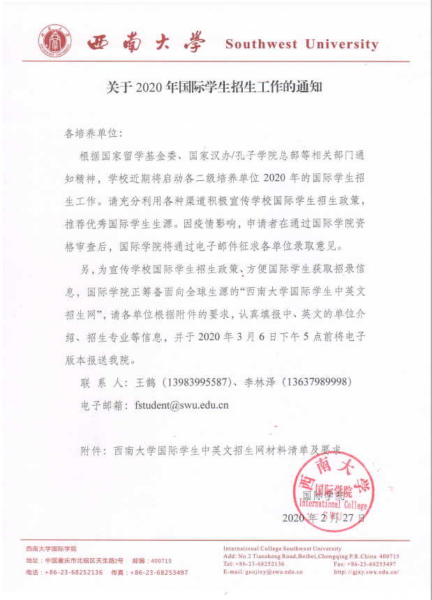 三是加强工作沟通。向学校各二级培养单位发布《关于2020年国际学生招生工作的通知》,提前部署谋划学校招生工作。