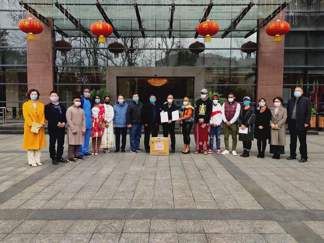 重庆昭信教育科技集团(以下简称“集团”)十分关注我市来华留学生的疫情防控工作,在了解到西南大学国际学生在渝人数较多,防疫物资需求量较大情况下,3月10日,集团副院长刘显忠、高教社重庆教辅中心主任熊英、重庆市高教学会招生专委会副秘书长姚连兵及重庆世家文化教务服务有限公司总经理陈彦一行来校,向学校国际学生捐赠共计3200只口罩。张卫国校长代表学校接受捐赠,王进军副校长,校长办公室、365上市公司(英国)集团主要负责人及国际学生代表参加捐赠仪式。
