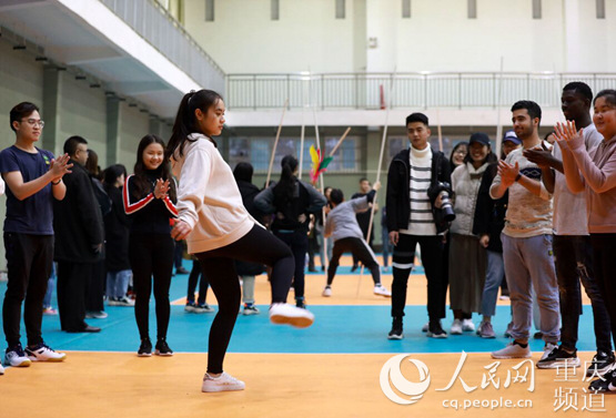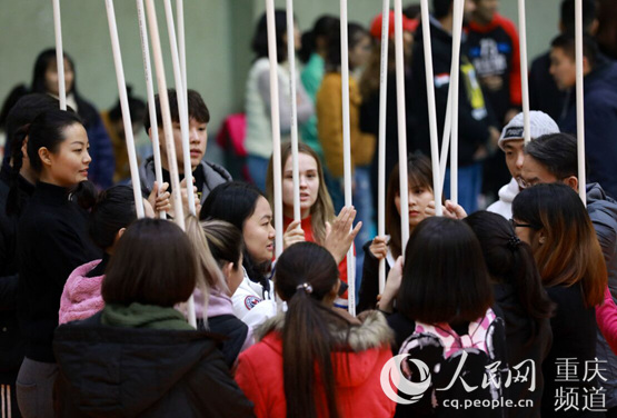 留学生们在体验“竹竿”随机反转旋转游戏。何超 摄