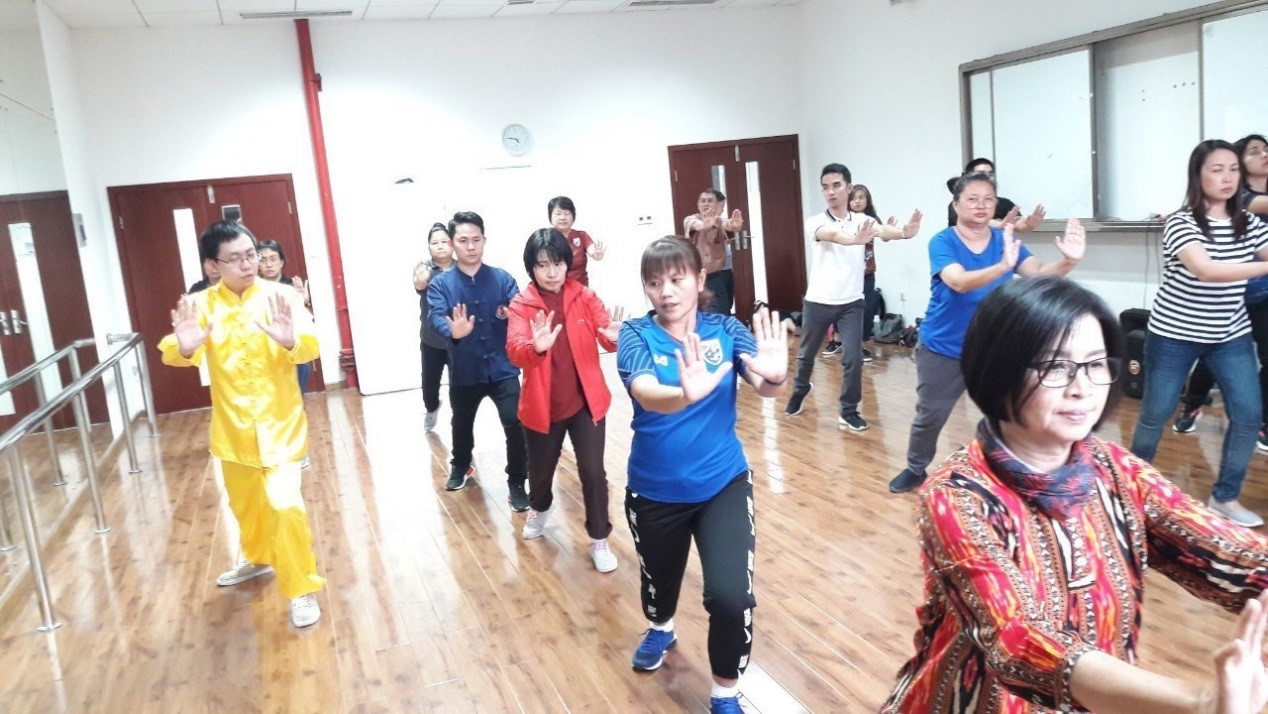 教师团员们的汉语水平分化较大,98%的营员汉语水平为HSK二级,2%的为HSK四级或五级。我院在汉语课程安排上注重汉语的日常交际功能和趣味性,调整授课方式,用情景教学的方法,通过角色扮演、制作模拟、场景运用等方式活学活用,不仅活跃了课堂气氛,更是让营员们牢牢地记住了汉语的相关表达方式和交际语言,老师们循循善诱,有的放矢,耐心讲解,互动讨论,对营员们汉语学习的兴趣和信心助益颇多。团员对老师的教学方法十分赞赏并觉得这样的学习很有趣也很有效率。此外,我院还为团员开设了太极课、中国书法、中国结等中华文化课程,深受团员们喜爱。同时我院为团员们安排了5名在校汉语专业泰国籍留学生担任语伴,在学习和生活方面给予团员们全面支持和帮助。