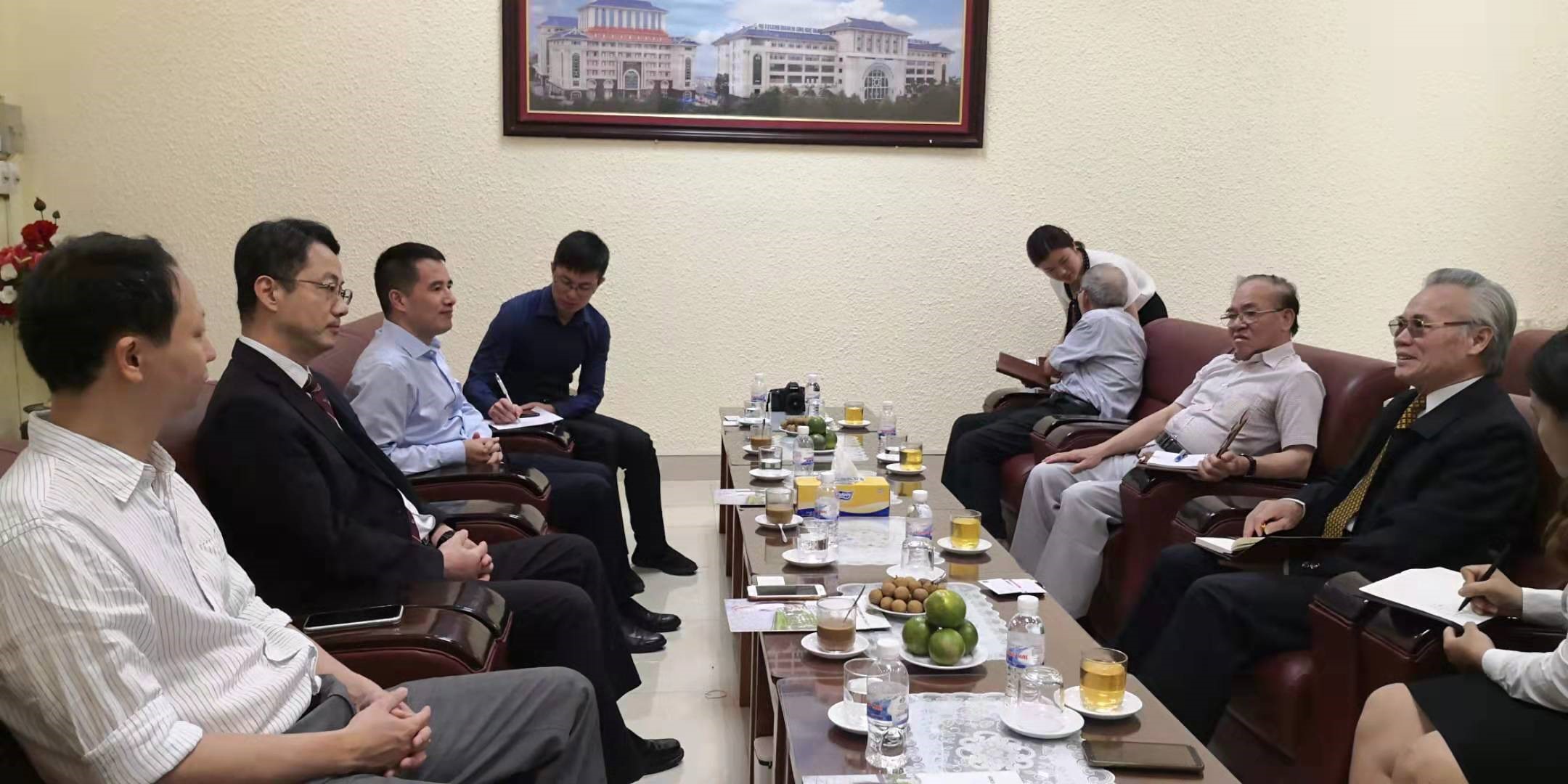 8月27日,代表团一行访问了越南商业技术大学,并与该校副校长Tran Duc Minh先生、国际处副处长Nguyen Ba Phuc先生、Nguyen Xuan Dau先生、中日文系主任裴清博士等进行了合作洽谈。在简要介绍了学校情况后,双方就汉语专业联合培养、汉语国际教育硕士专业境外办学、短期访学团组来访、学校来华访问团等事项进行了首次洽谈。会后,代表团一行在工作人员的带领下参观该校校园。