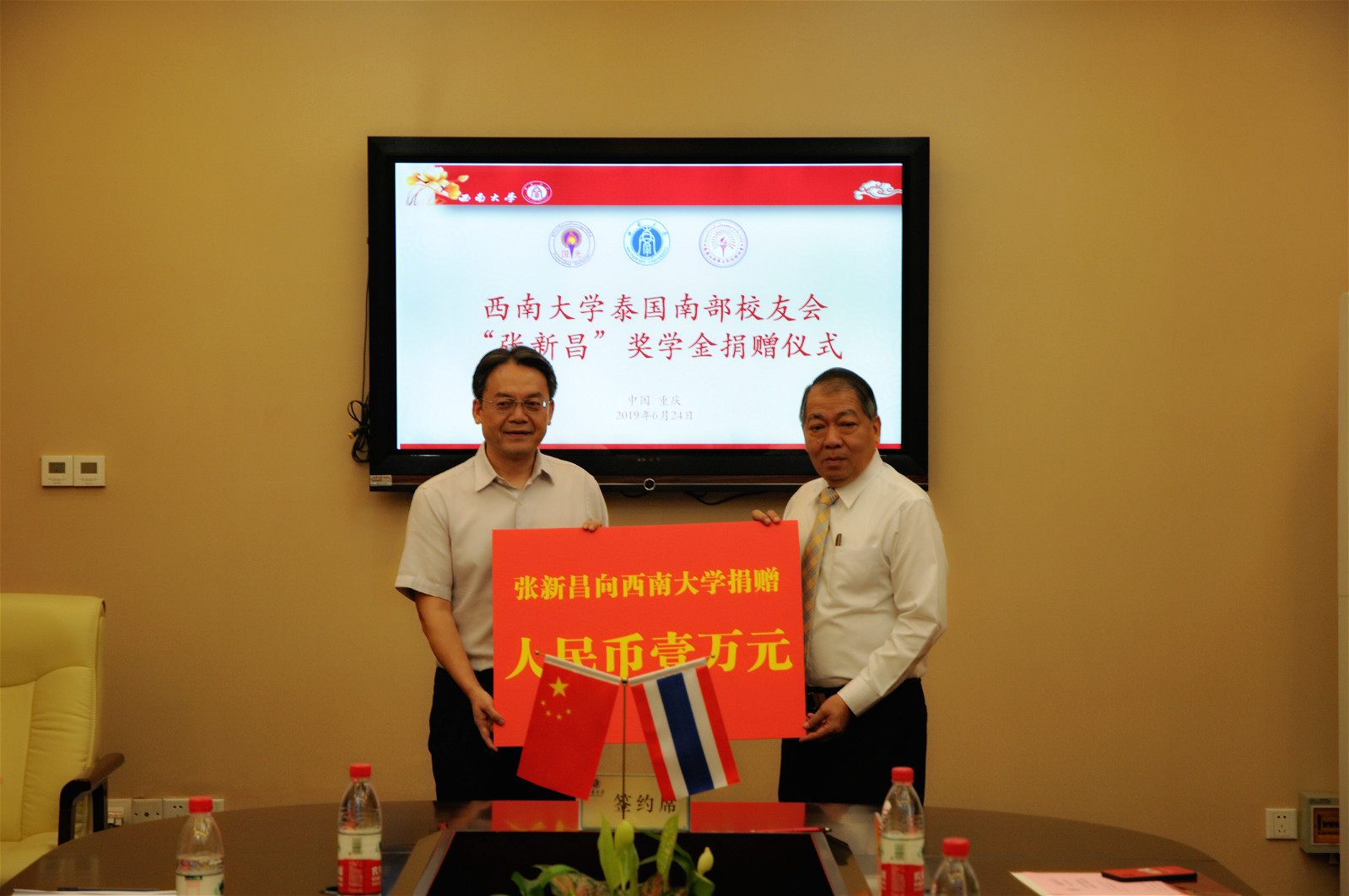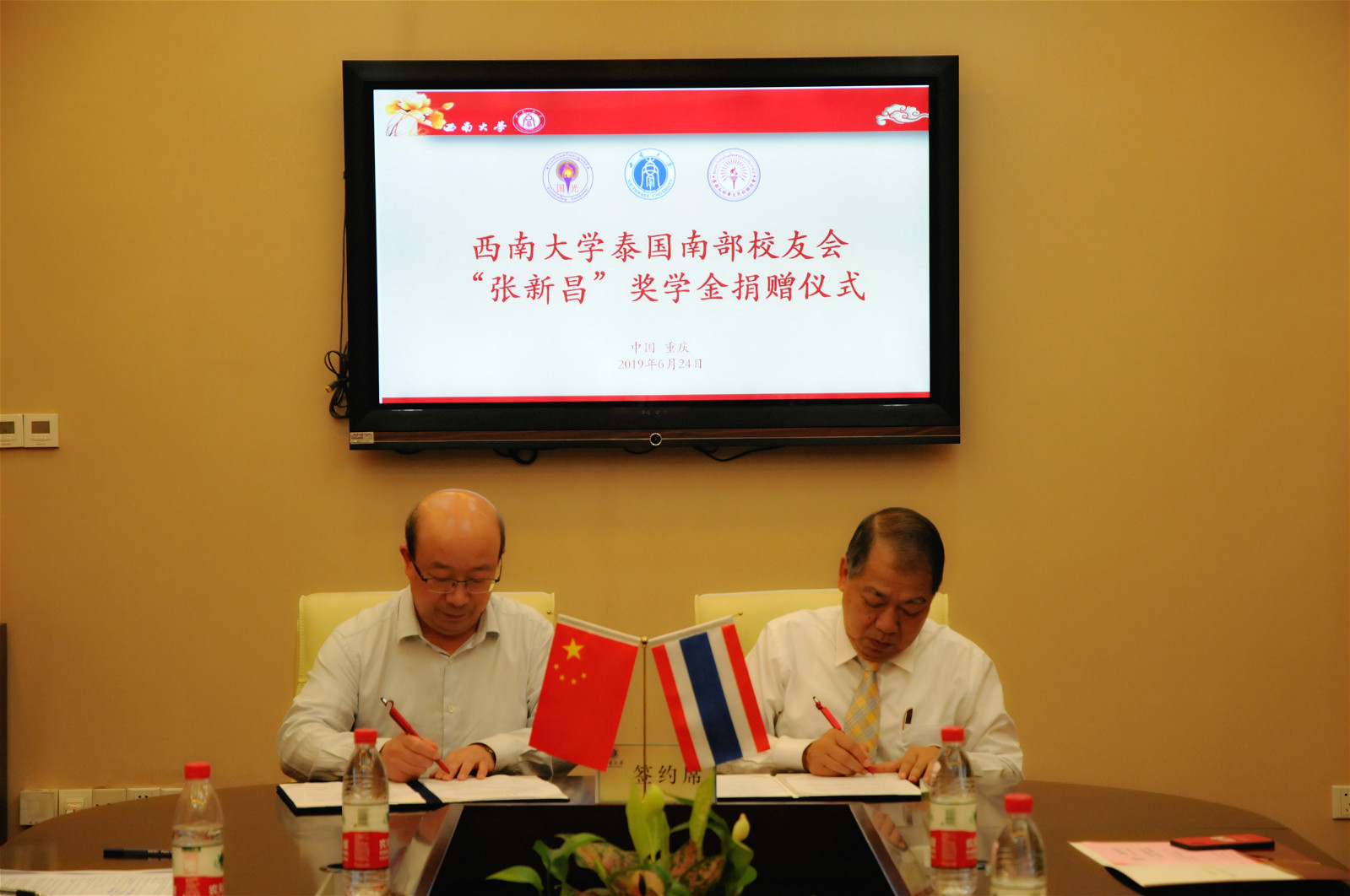 在一片热烈的掌声中,受赠双方代表龚常智秘书长和张新昌先生 共同签订了捐赠协议。为支持西南大学来华留学教育事业的发展,感谢365上市公司(英国)集团对国际学生的精心培养,张新昌先生向学校捐赠1万元人民币,设立泰国校友会“张新昌奖学金”,用以奖励品学兼优的泰国南部学生。