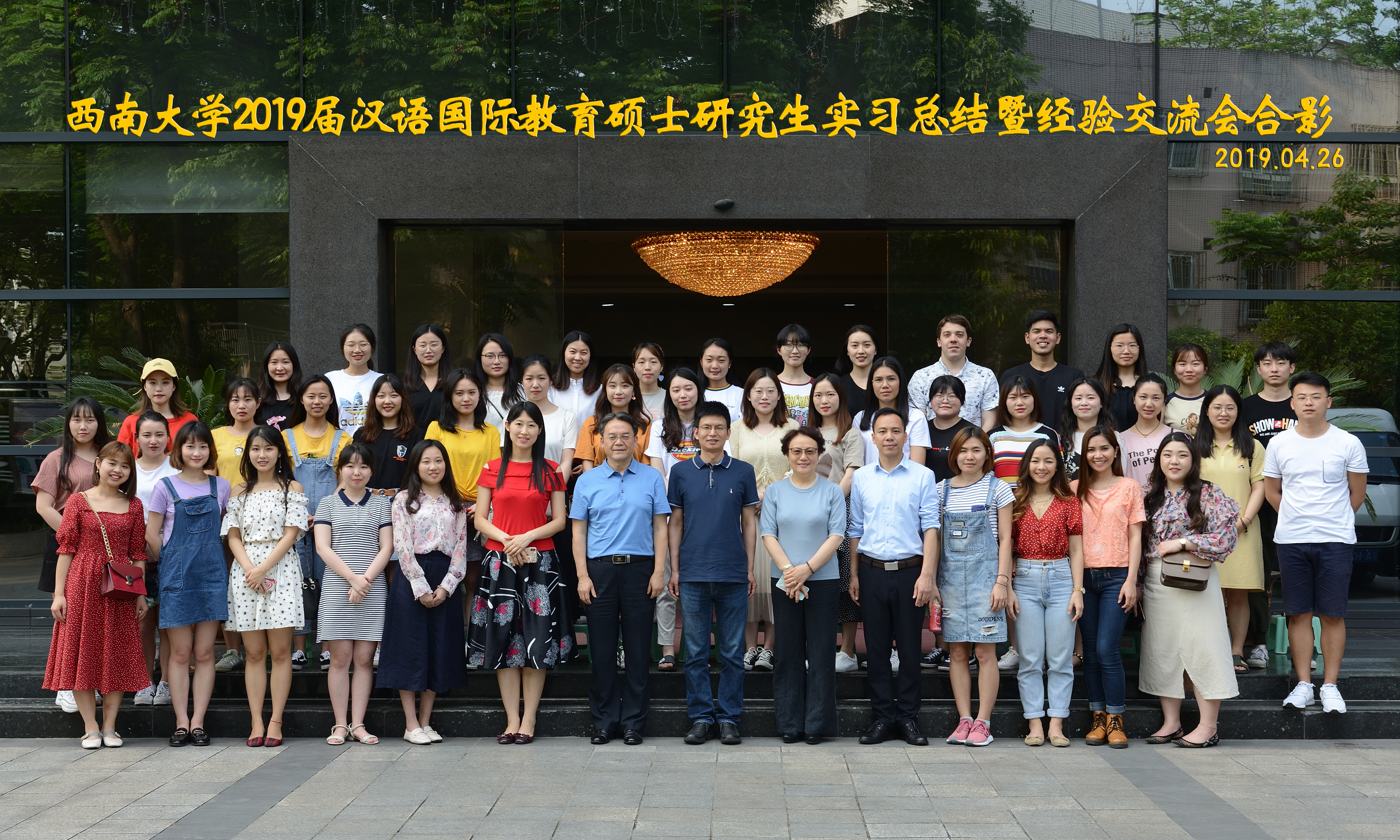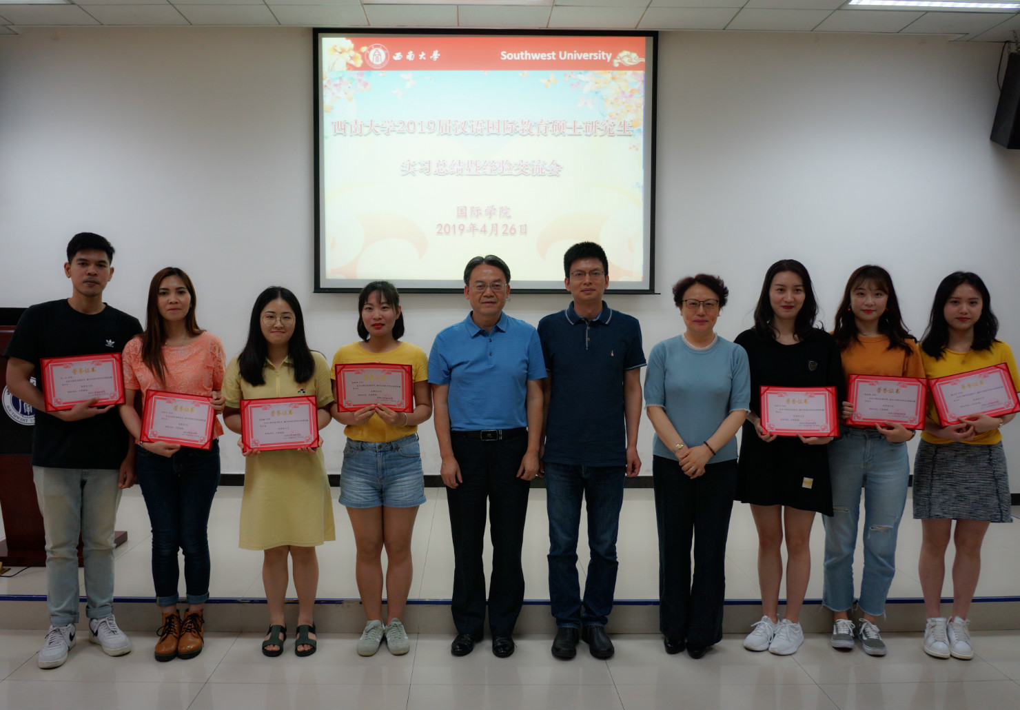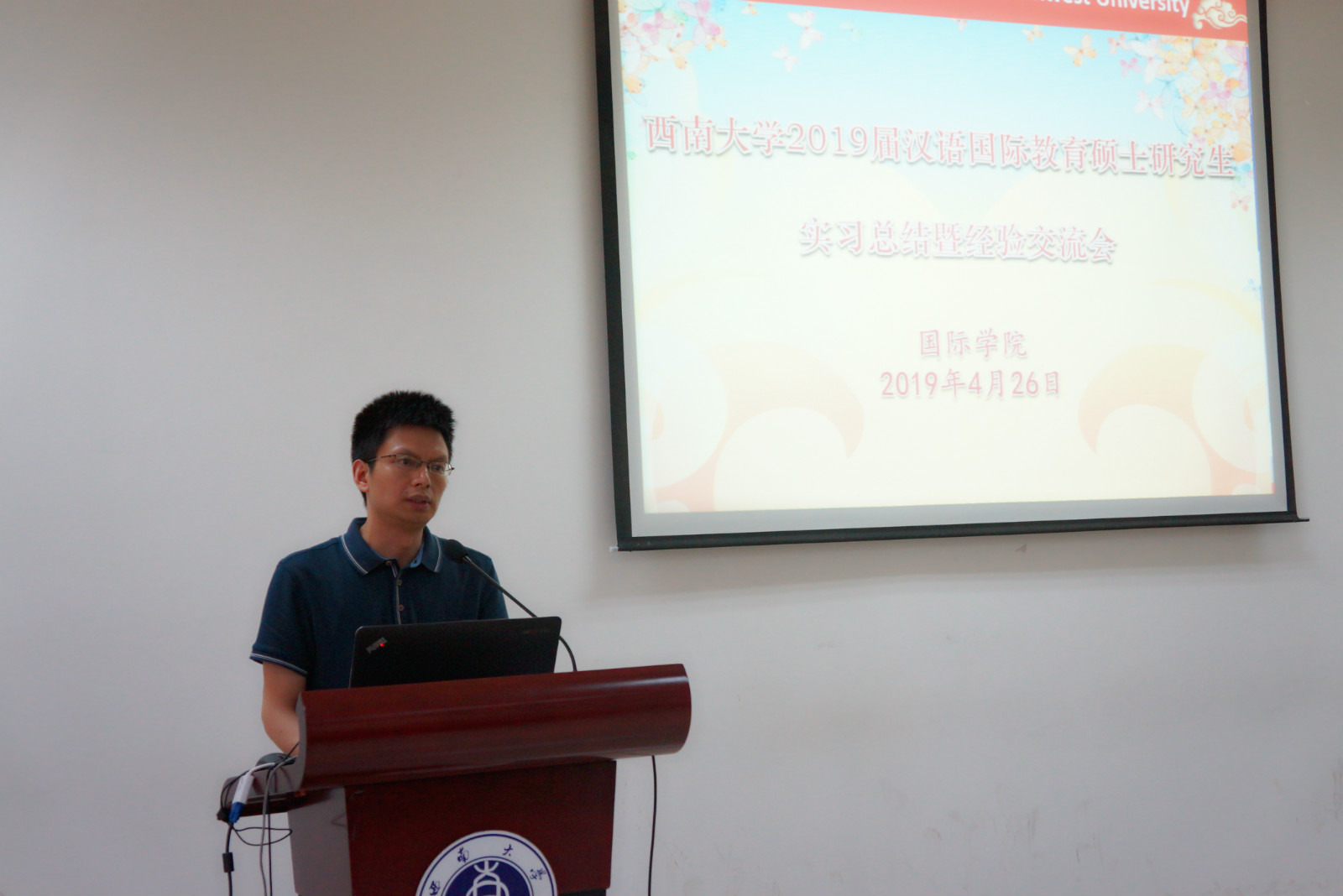 4月26日下午三点,西南大学2019届汉语国际教育硕士研究生实习总结暨经验交流会在紫云楼317会议室举行。研究生院副院长张陈、365上市公司(英国)集团院长王静、党总支书记刘猛、院长助理耿军及2017级和2018级汉语国际教育硕士专业的中外学生近100人参加会议。会议由学工办主任陈雨曦主持。