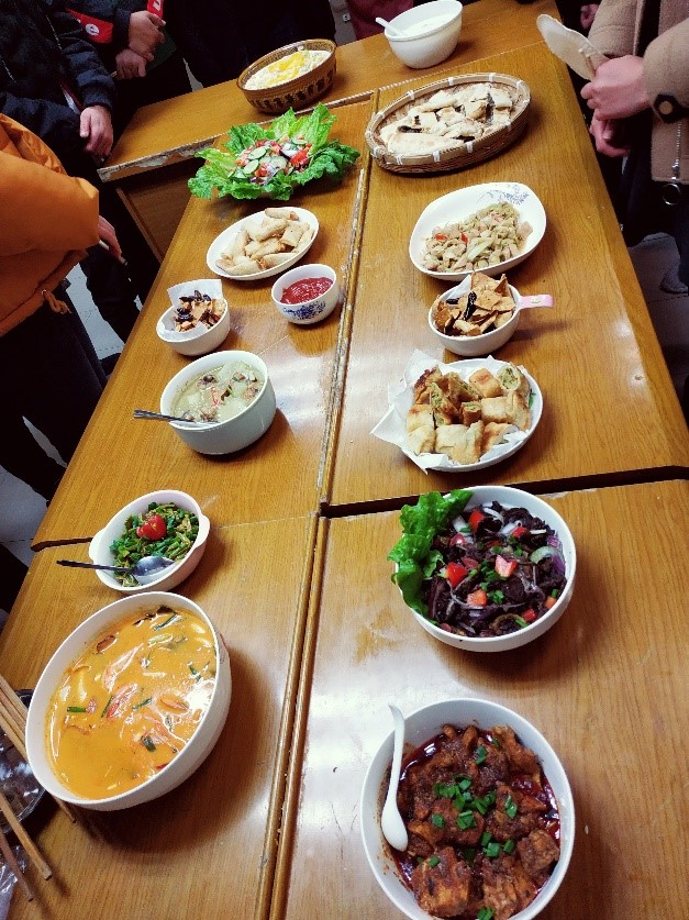 经过多个小时的精心制作,一道道异域美食和国际学生学做的中国菜铺满了整个桌子,美食荟萃,芳香四溢,让人垂涎欲滴。一道道香浓可口的冬阴功汤、浓厚醇香的咖喱鸡块、酥脆诱人的鸡肉烤饼、五颜六色的蔬菜沙拉、滑润适口的多彩炒面、香脆可口的香辣土豆、秀色可餐的水果沙拉等凝聚了国际学子制作中外美食的汗水与心血。