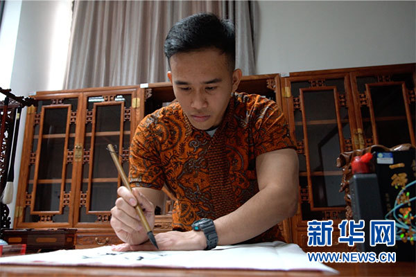印度尼西亚留学生刘文才在“中华才艺教室”练习书法。新华网 马天龙 摄