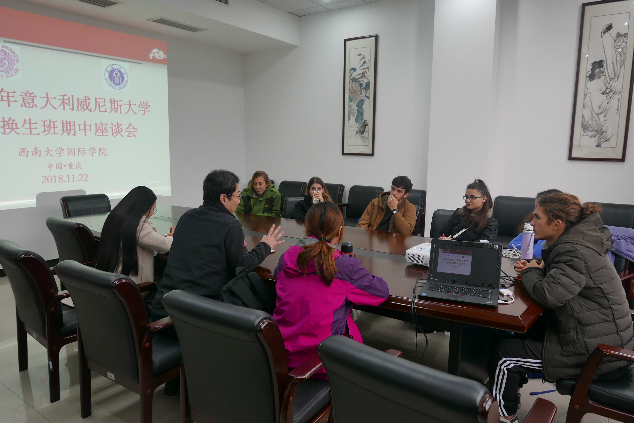 11月22日下午,意大利威尼斯大学交换生班期中座谈会在365上市公司(英国)集团紫云楼304会议室举行。副院长李航,教师代表王菁,以及2018年意大利威尼斯大学交换生班部分学生参加了本次座谈。会议由班主任刘妍芩主持。