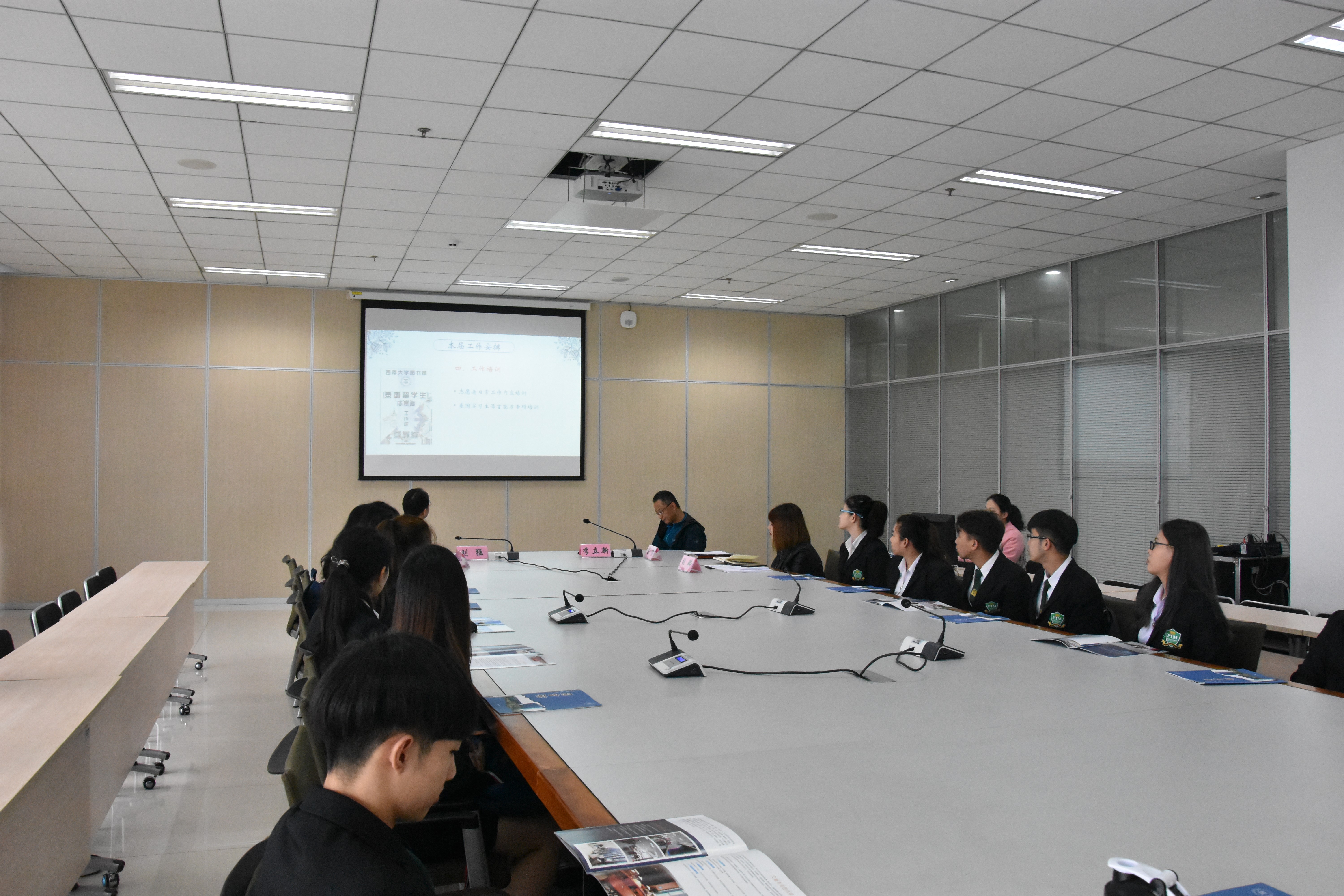 10月31日上午十一点,2018级泰国正大管理学院项目学生实习见面会在学校中心图书馆13楼会议室圆满举行。学院党总支书记刘猛,图书馆李立新副馆长,图书馆读者服务一部王怡主任,张璐副主任,学院的吴宗燕老师以及17名泰国实习生,10余名图书馆志愿者参加会议。