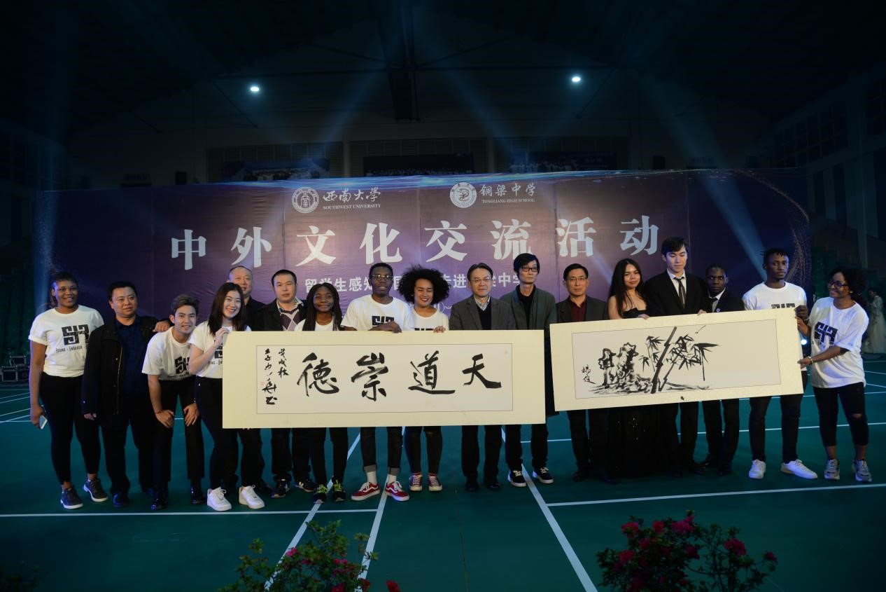 10月25日下午,国际学生们有幸受邀来到铜梁中学,走进中学课堂与中国师生交流沟通,分享经历,了解彼此国家文化。在课堂中,国际学生们了解了中国的礼仪知识,饮食文化,学习书法艺术和中国结的编制。随后,国际学生们与铜梁中学的学生们一同参观校史馆并共进晚餐。