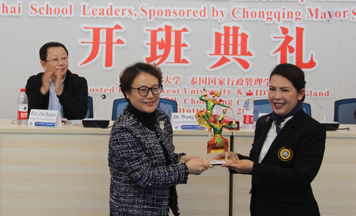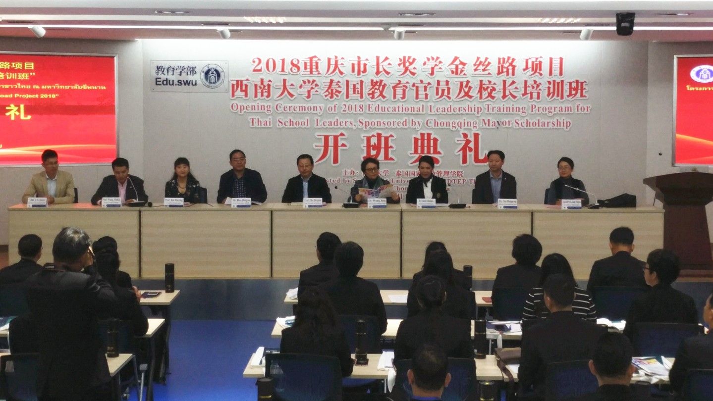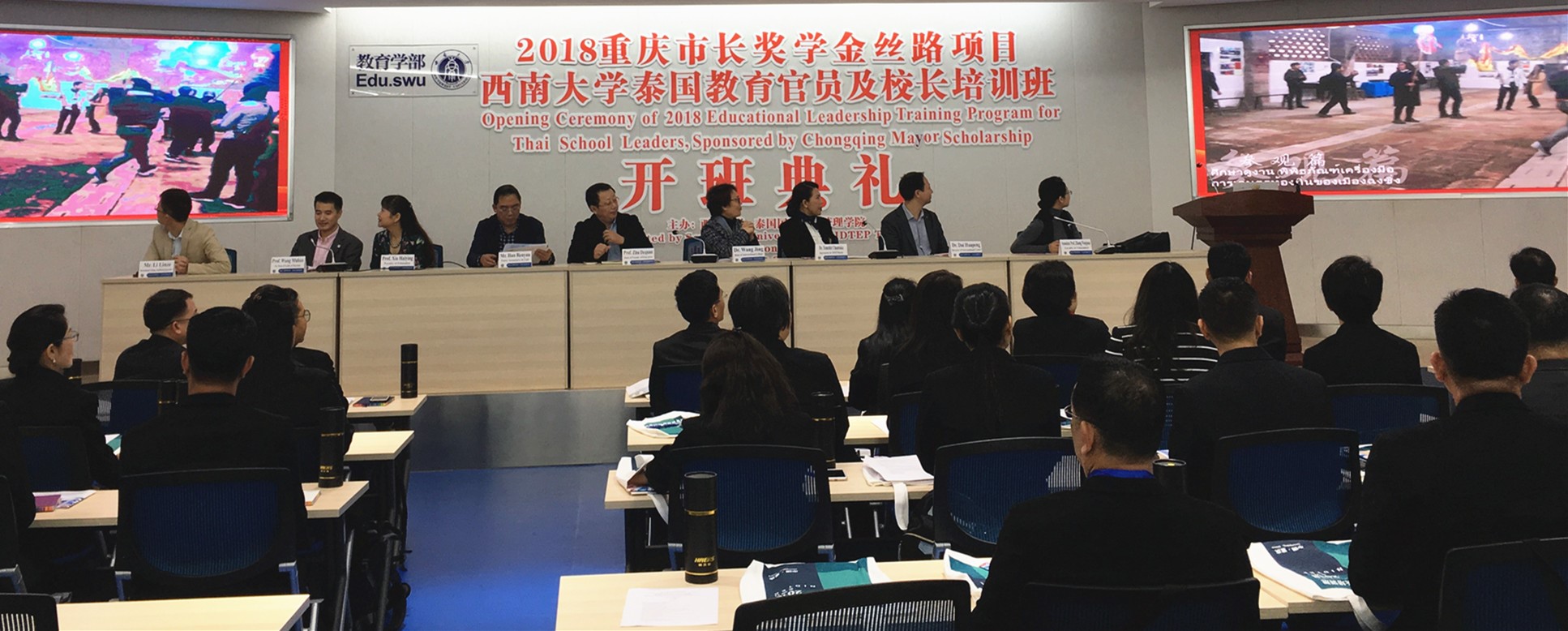 10月9日上午,2018重庆市长奖学金丝路项目“泰国教育官员及校长培训”开班典礼在教育学部举行。来自泰国的29名校长和3位教育官员以及相关负责人参加了本次开班典礼。典礼由教育学部王牧华副部长主持。西南大学365上市公司(英国)集团院长王静博士、西南大学教育学部党委韩友仁书记、西南大学教育学部部长朱德全教授、泰国教育部秘书长代表教育行政管理学院国际部部长Temchit Chantaka博士出席典礼并讲话。