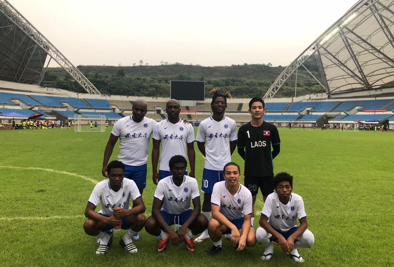 学校国际学生足球队在决赛中与广鹏燃气狭路相逢,冠军之战在37°的酷暑中打响。开场仅五分钟,来自莱索托的托马斯一记远射首先破门。对方球员不甘示弱,很快将比分扳平。队长阿普杜随即以一记精彩的推射还以颜色。随后,学校代表队队员们越战越勇,连连破门。终场前4分钟,来自几内亚比绍的李想再入一球,把比分牢牢锁定在9:1,最终学校代表队荣获冠军。