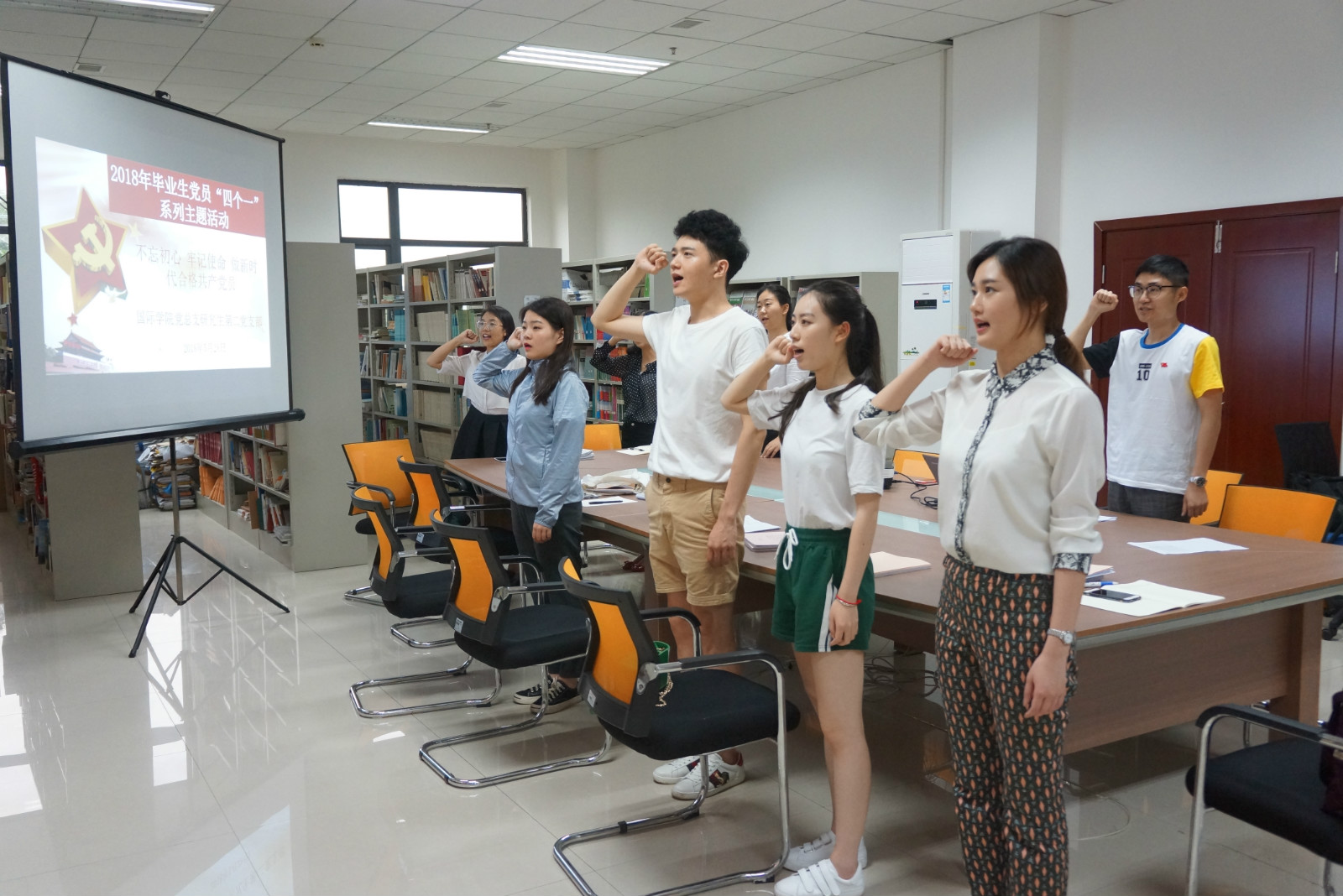 本次教育活动内容共分为四个部分。首先,支部书记王湛明带领所有参会党员开展重温入党誓词的宣誓活动,教育引导党员时刻牢记共产党员的身份与职责。接着,王湛明围绕争做“四讲四有”合格党员这一专题讲了一次党课。随后,王湛明就毕业生党员组织关系转接、党员材料交接等对全体毕业生党员进行了培训,增强了毕业生党员的组织观念和纪律意识。最后,布置了以“给师弟师妹的一封信”为主题的教育实践活动任务。